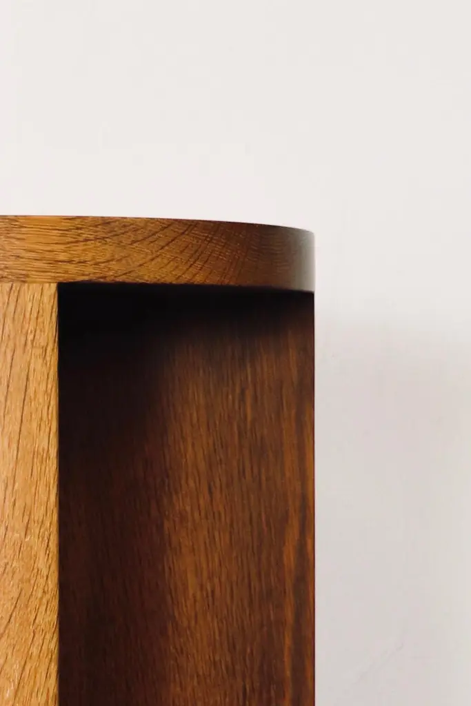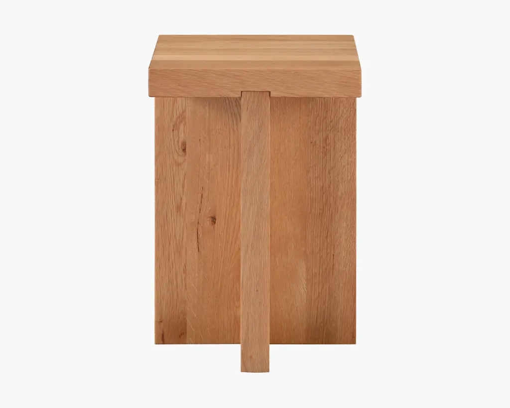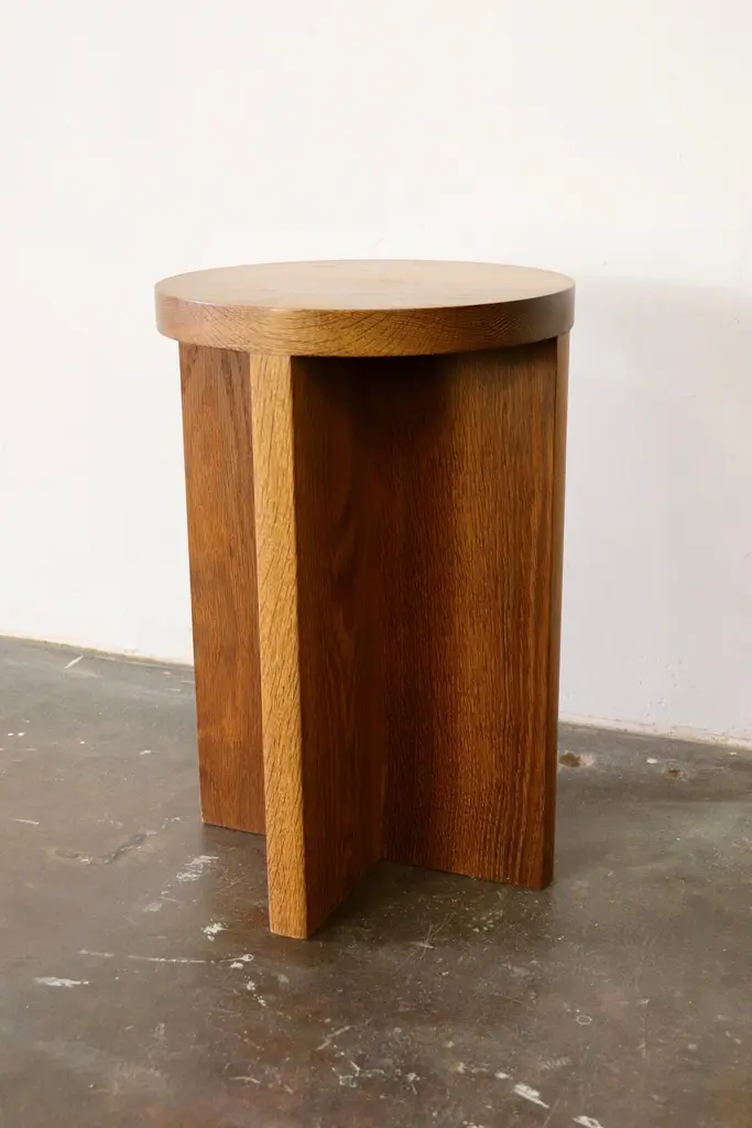Solid wood stool / side table in fumed white oak with round top. The fuming process reacts with the tannins in the wood and results in a color through, rich amber tone. With a clean and minimal design, these stools are handmade in Portland, Oregon with mortise and tenon joinery in Material's workshop. Also available with a square top, in a number of other wood species.