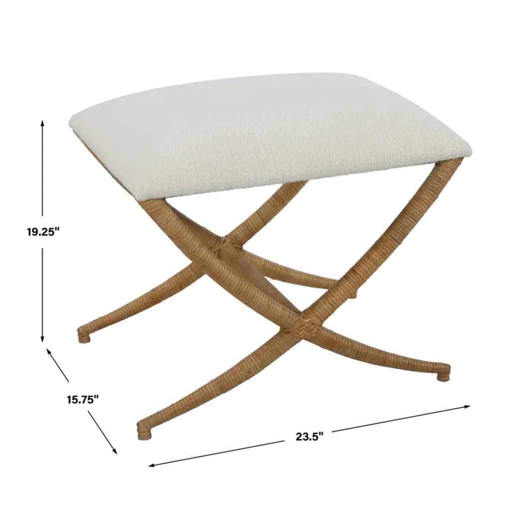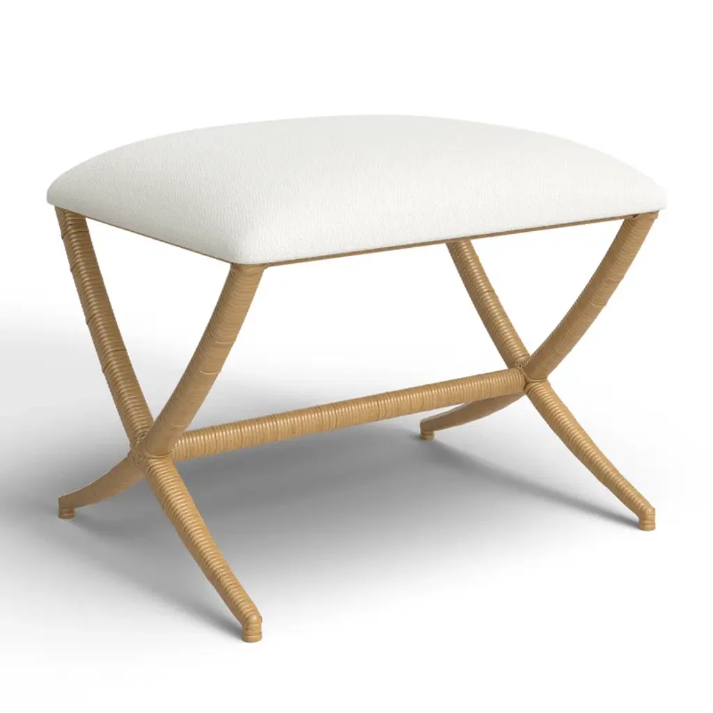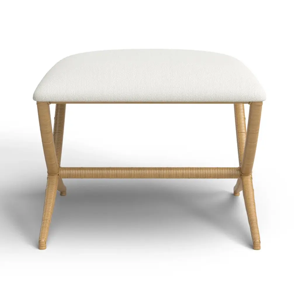 The perfect casual accent, the expedition stool displays coastal influence with a natural rattan-wrapped iron base. The cushioned seat is upholstered in a crisp white textured polyester fabric.