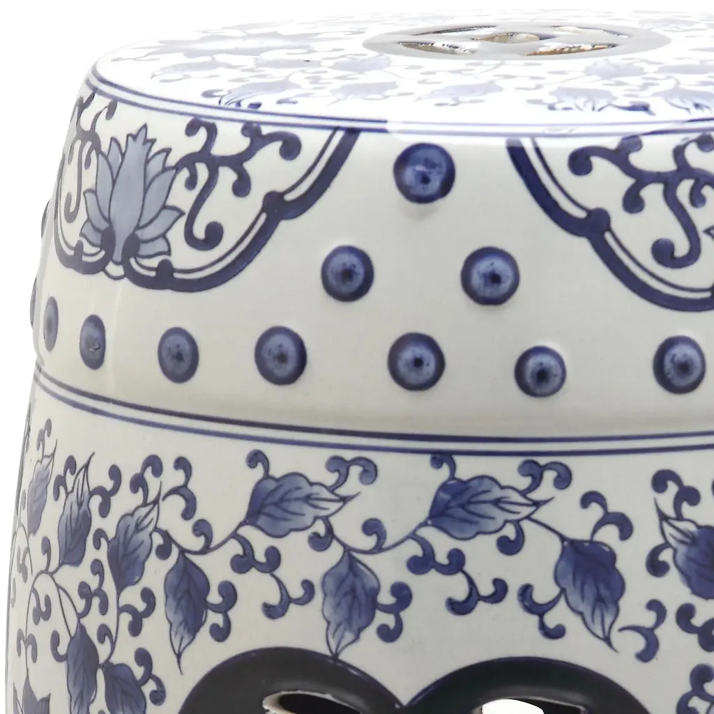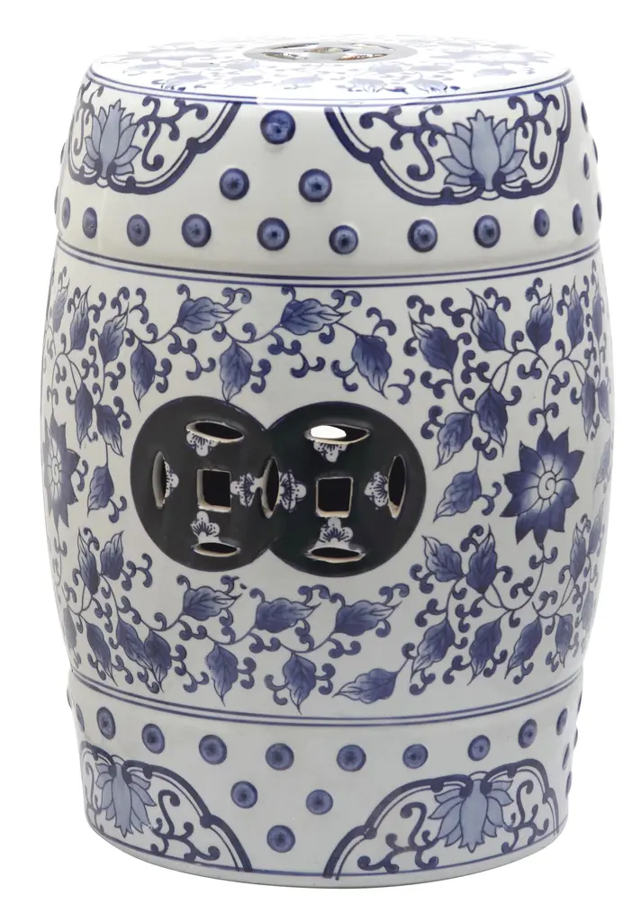 A classic blue and white floral pattern of Chinese export porcelain adorns the garden indoor-outdoor garden stool. Crafted of glazed ceramic with pierced lucky coin motif on it's base and top, this artful accessory complements myriad decorating styles. Wipe with damp cloth. Avoid the use of chemicals and household cleaners as they may damage the finish. Suitable for outdoor use, avoid extreme temperature and store indoors during long periods of inclement weather.