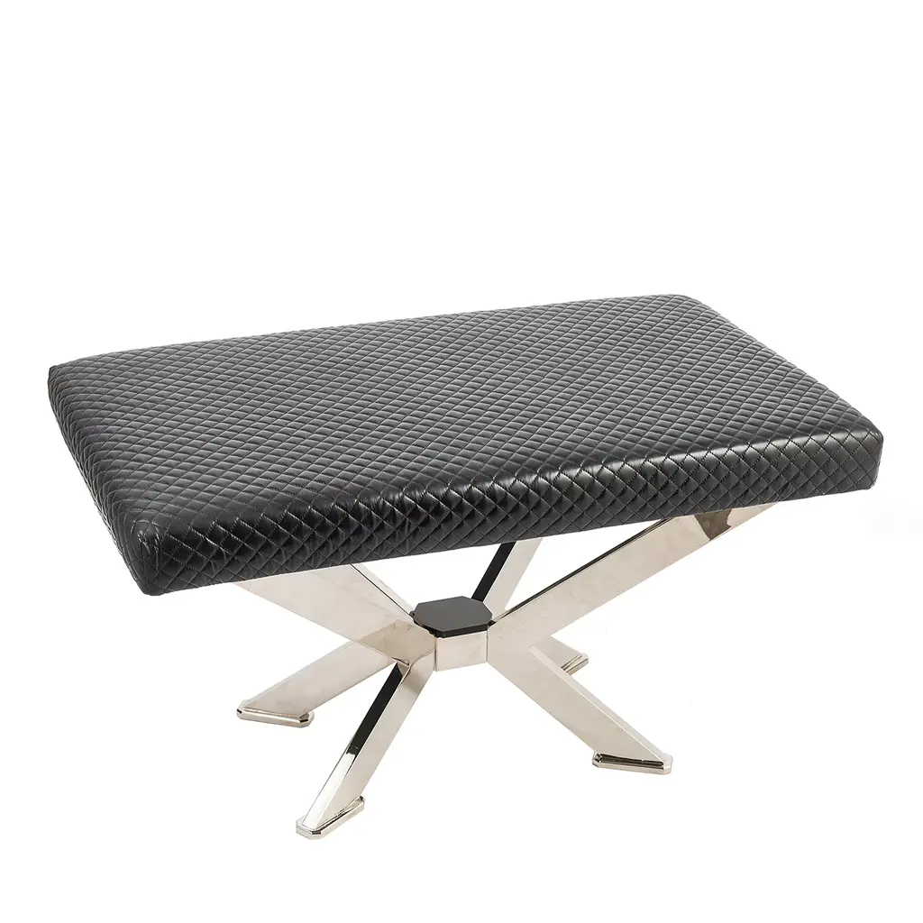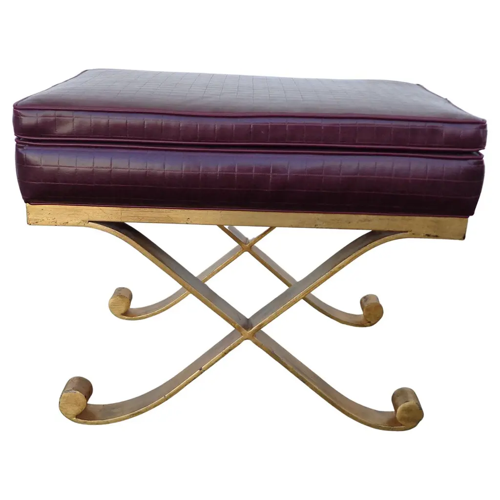 The Garrett Leather Stool has a polished brass "X" base and a green leather seat. The seat has a crisscross pattern repeating the design of the base. This stool is the right size for a vanity or extra seating in a family room.