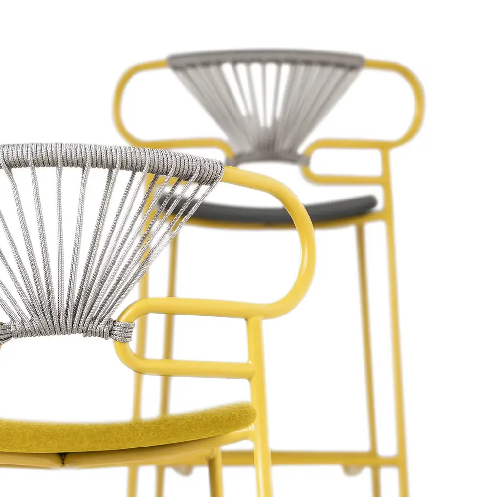 Excellently designed by Cesare Ehr, this splendid stool is part of a collection of seatings marked by a unique contemporary silhouette. A vivacious addition to modern decor, the yellow-lacquered metal structure of the frame is complemented by the yellow fabric covering the seat, while a rope interweaving enriches the backrest, which is crafted of a single metal tube curved in a sinuous geometric pattern. This piece is available in an outdoor version and in other finishes and colors, please consult the Concierge for details. Contract and commercial certifications available upon request.