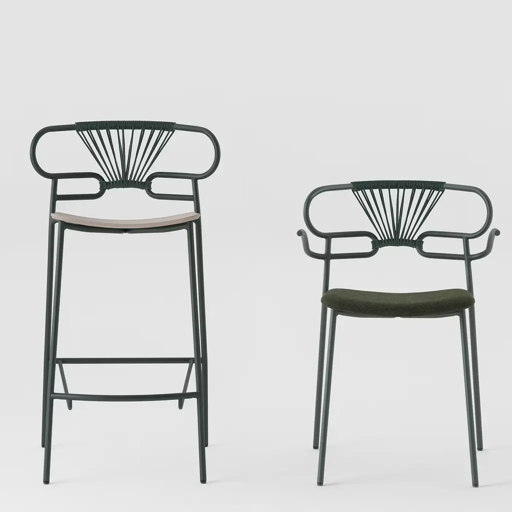 A timeless combination of lines, this stool from the Genoa Collection of seating solutions designed by Cesare Ehr will stand in a contemporary interior. Distinguished by a "one-line" backrest made of a single, curved cylindrical metal element enriched with a rope decoration, it boasts a total-green hue only contrasted by the bleached ash wood seat, also available in polyurethane or upholstered with fabric, leather, or faux leather, please ask the Concierge for further details.