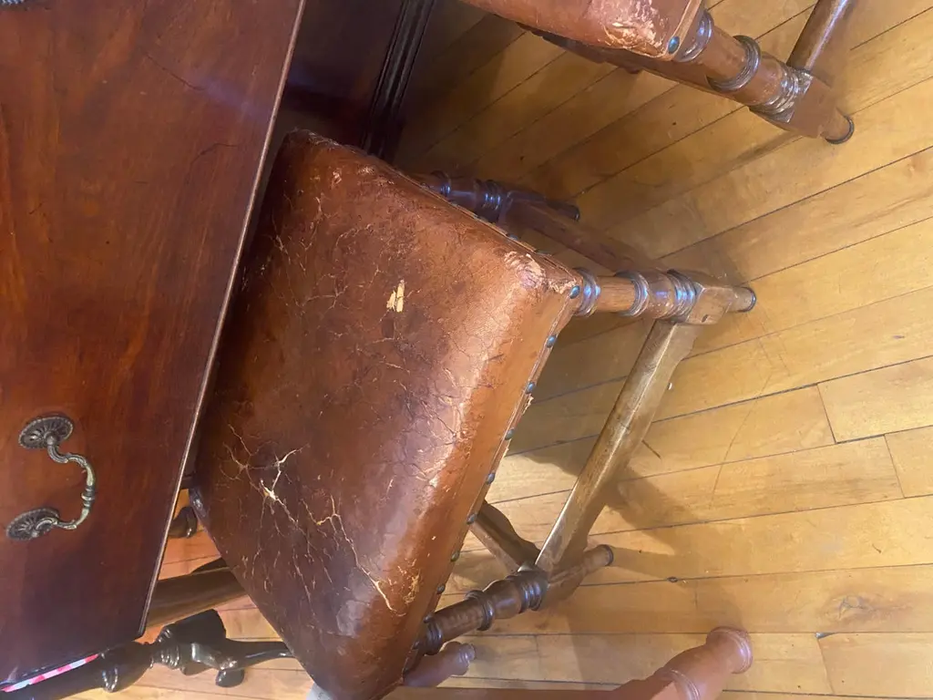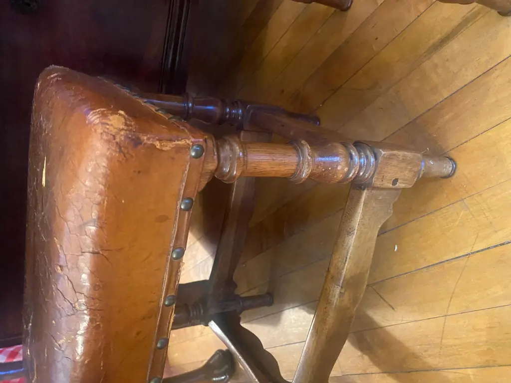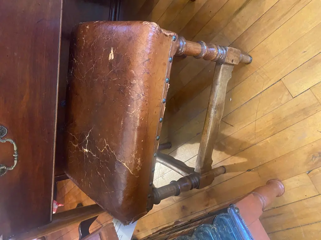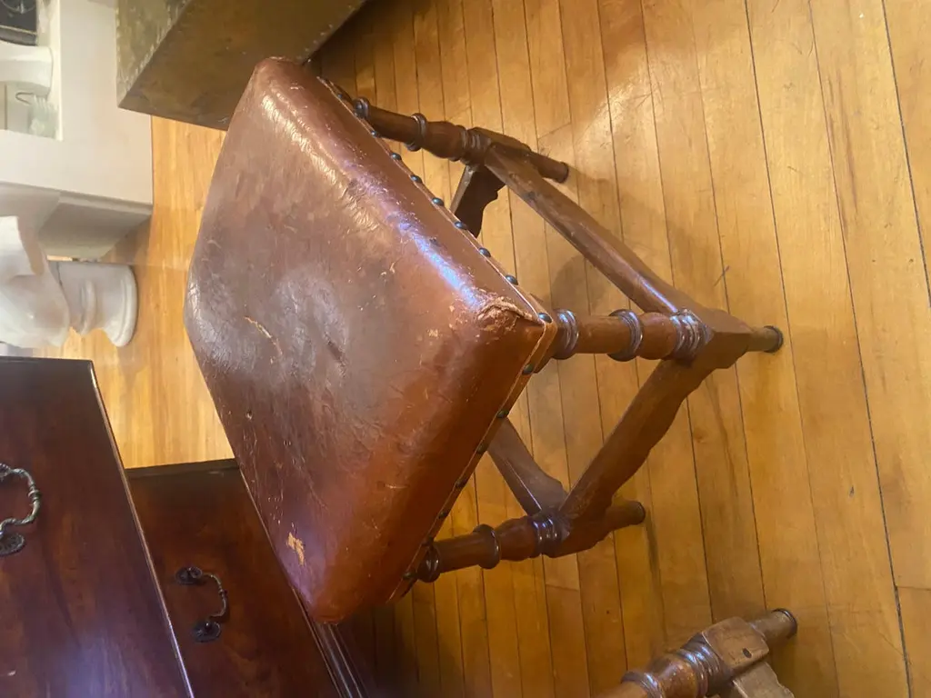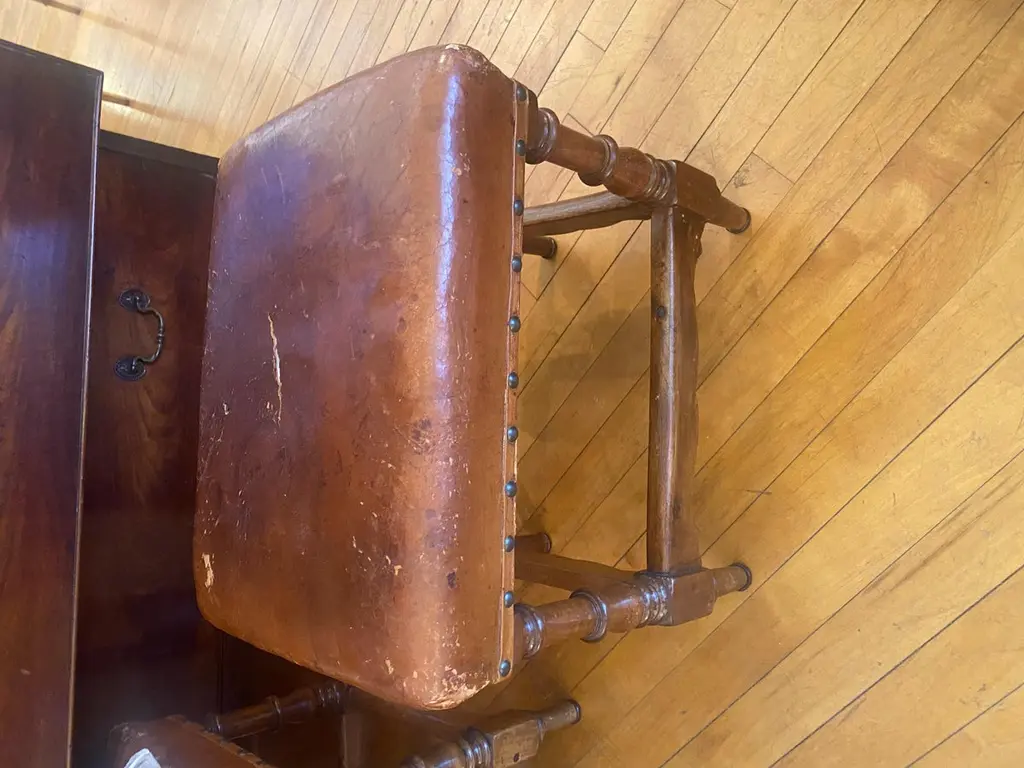 A pair of George V leather upholstered fireside stools with nail head trim. Distressed leather is original. Lovely old patina, great color. Priced per stool. Would look great in library, office or living room. Handsome.