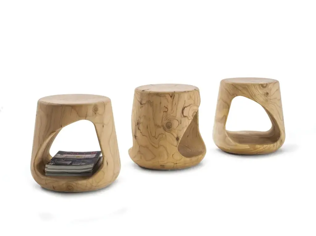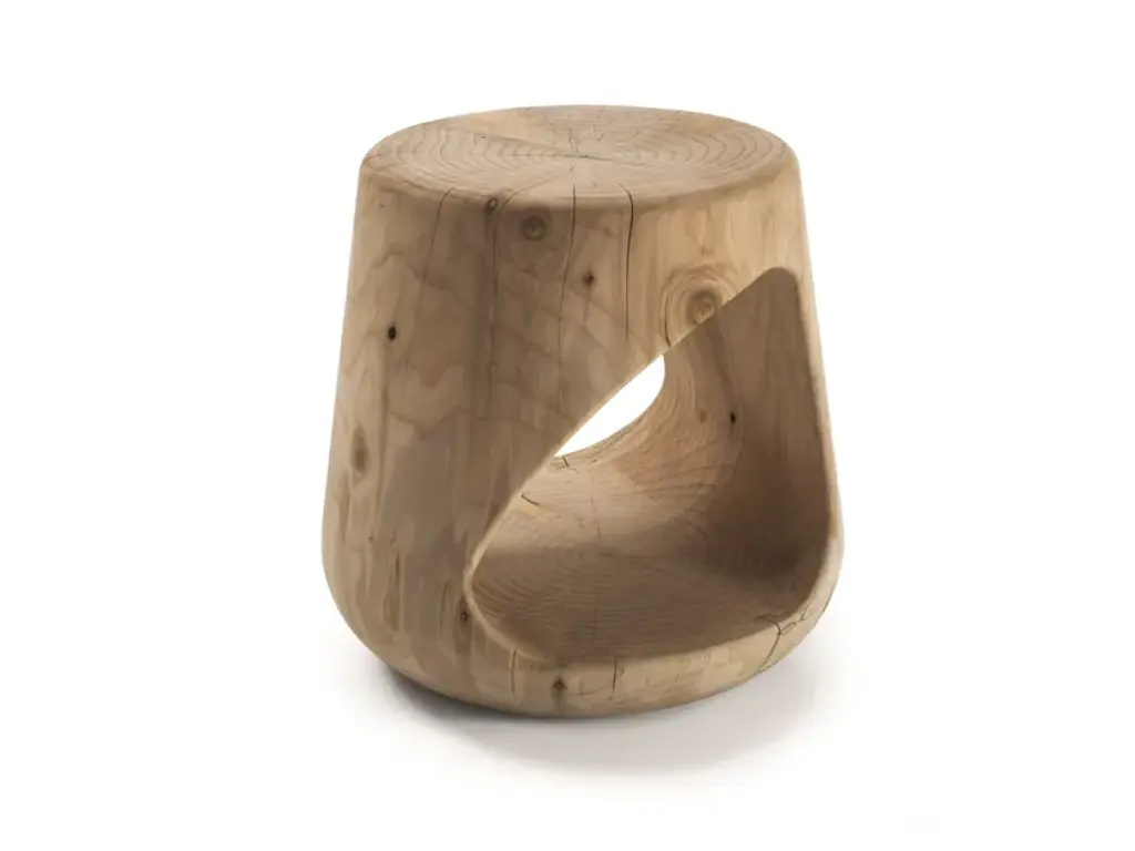 Geppo is a stool in solid wood of scented cedar made from a single block, is characterized by its “soft” and curvilinear shape. Its particular shape with an open space under the seat is useful for storing objects, books, etc. Thanks to its features, it can also be used as a small table or as a night table.AVAILABLE FINISHES:A7: cedarA9: cedar contract finish, vulcano cedar