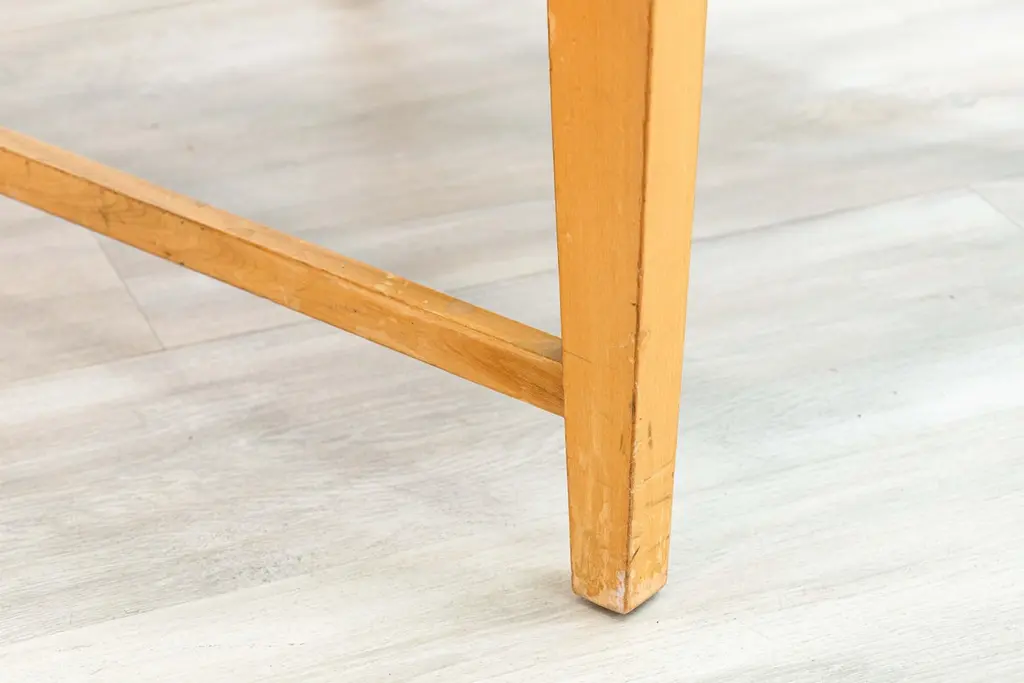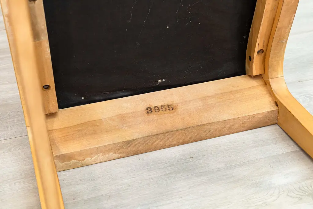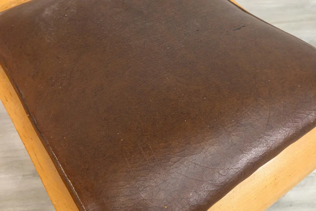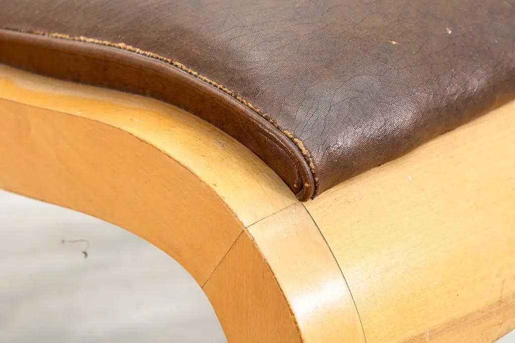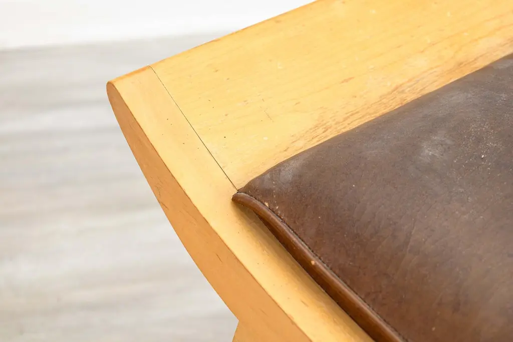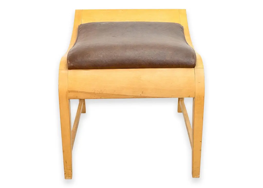 A modern “Vanity Stool or Base, Model 3955” designed by Gilbert Rohde for Herman Miller, circa 1935. Stamped model number on the underside. Maple wood and original brown leatherette upholstery. The silhouette features subtly curved and a minimalist structure, showcasing Rohde’s preference for clean lines and material integrity. Designed to pair with his celebrated vanities of the mid-1930s, this piece reflects the designer’s belief in harmonizing comfort, utility, and progressive aesthetics. Examples of this model have been featured in exhibitions on American design evolution and Herman Miller’s early modernist legacy. Provenance: From a private estate in Southeast Michigan. Dimensions: 18.5”h x 18.5”w x 24”d x 17”seat height. In very good condition. Full condition reports are available upon request. Gilbert Rohde (1894-1944) was a pioneering American industrial designer who played a crucial role in shaping modern furniture design in the United States. Best known for his transformative work with Herman Miller in the 1930s and early 1940s, Rohde moved American design away from traditional revival styles toward streamlined, functional modernism influenced by the Bauhaus and European avant-garde. Rohde’s work has since been exhibited at major institutions including the Museum of Modern Art (MoMA) in New York, the Cooper Hewitt Smithsonian Design Museum, and the Wolfsonian–FIU, which holds a significant collection of his furnishings.