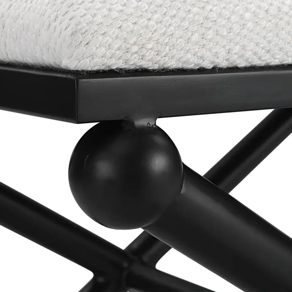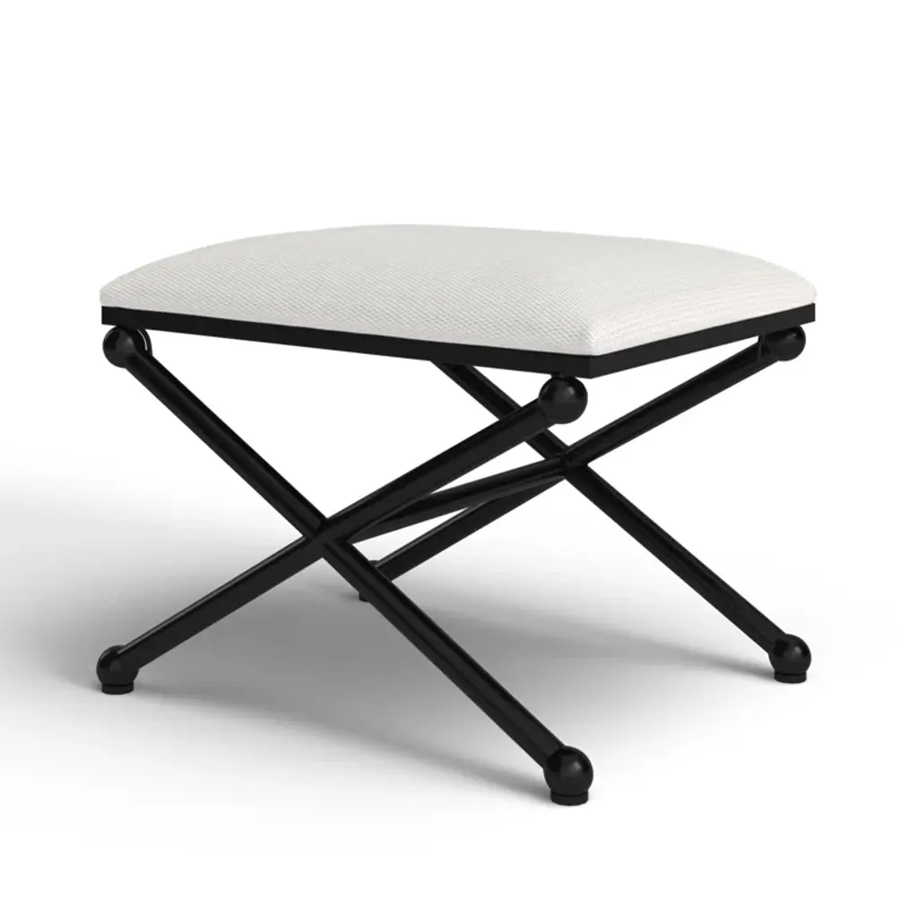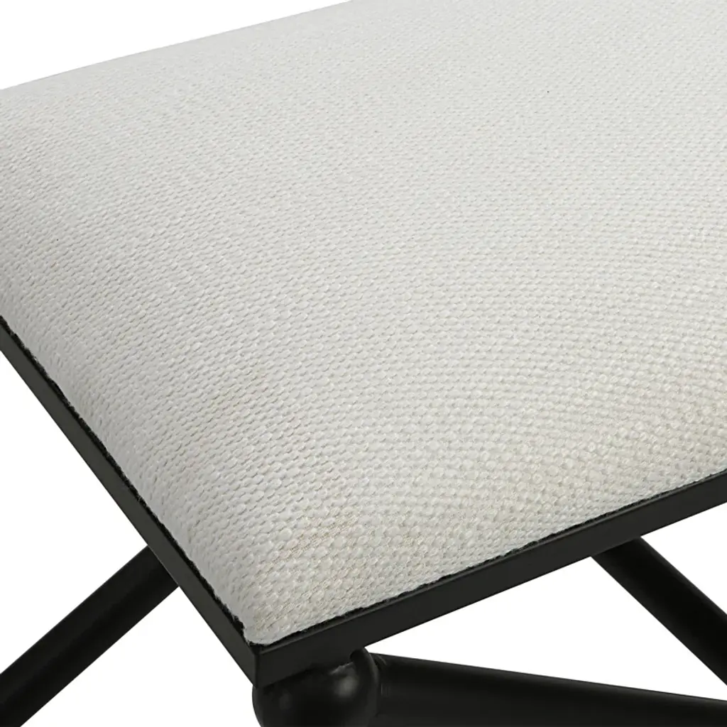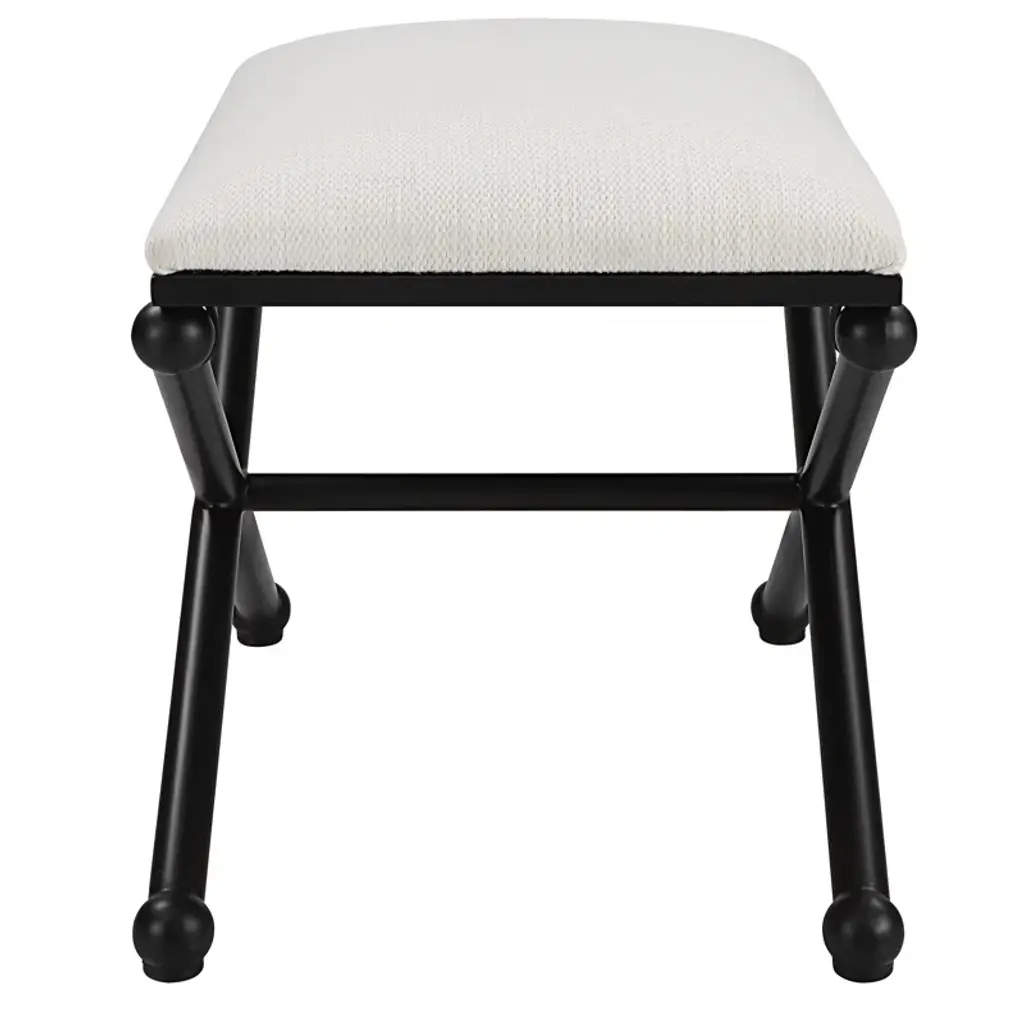 With classic simplicity, this small bench features a smooth iron base finished in satin black, and upholstered in a crisp textured white polyester.