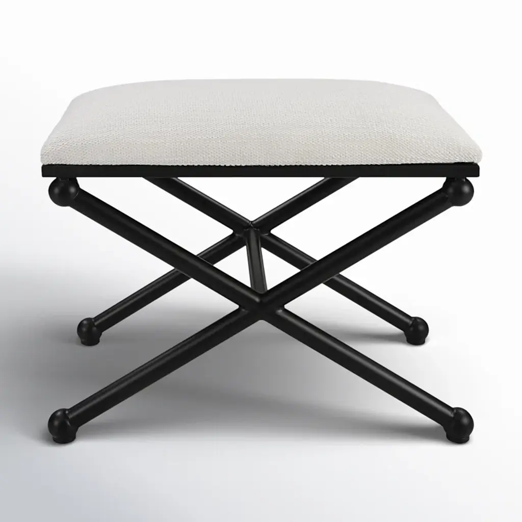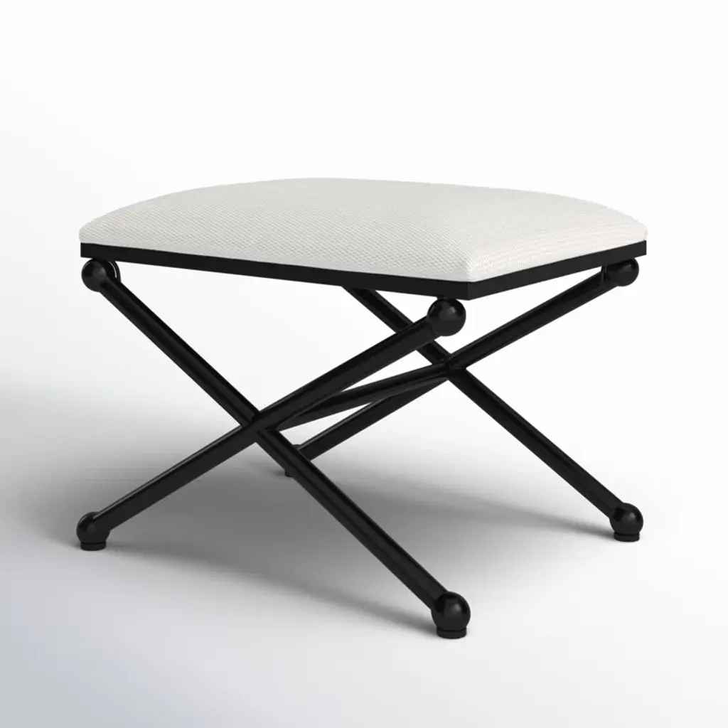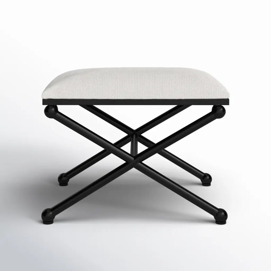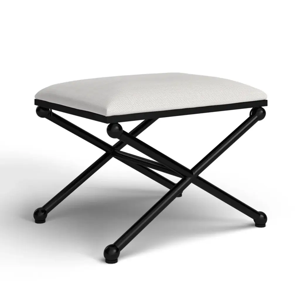 With classic simplicity, this small bench features a smooth iron base finished in satin black, and upholstered in a crisp textured white polyester.
