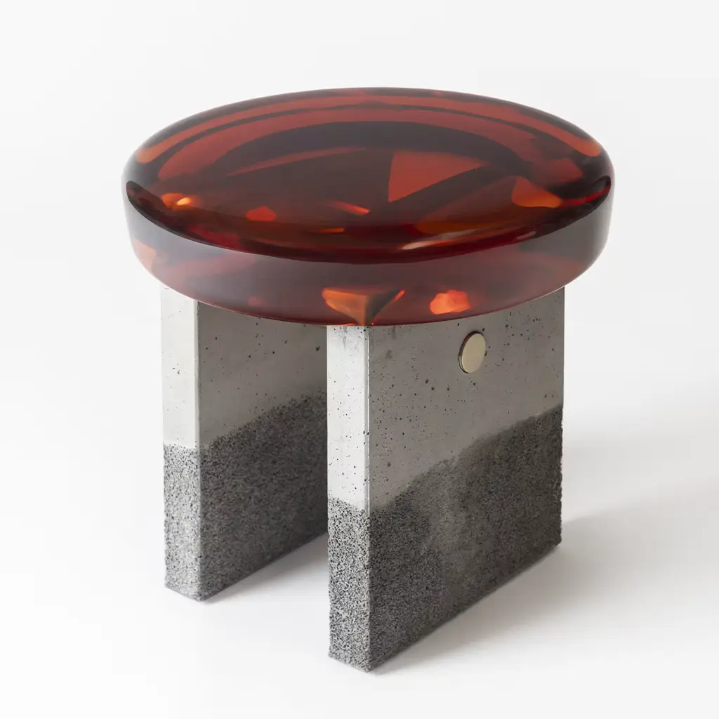 Comprising a stylized formal composition, Golia stool presents a thick round epoxy resin seat resting upon two squared concrete legs. The transparent resin reveals the shiny metal links below, creating a multi-level view that lightens the solidity of the base. Available in different colors.