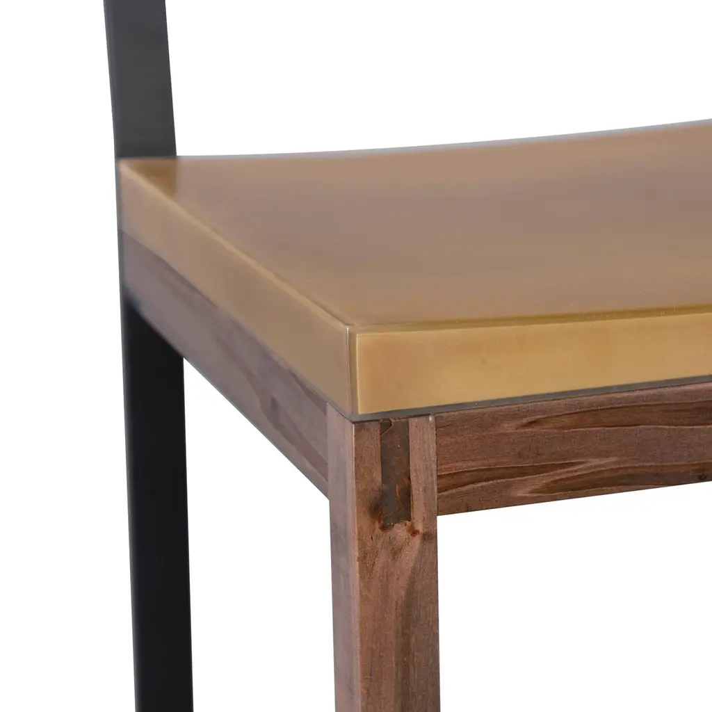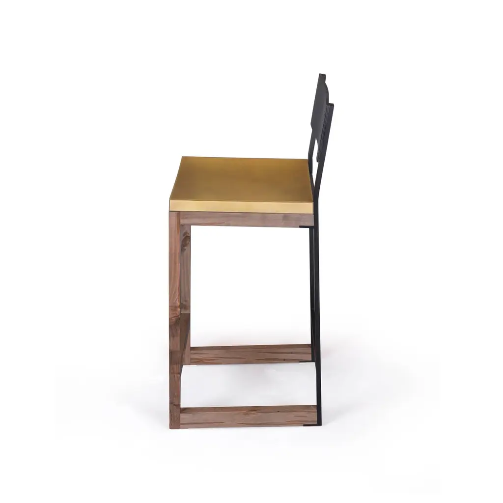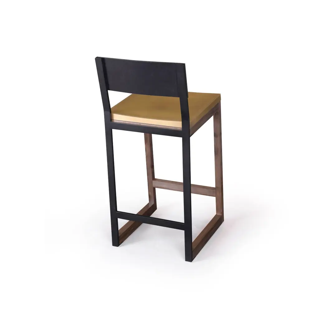 The sleek design of the gotham stool features a Bronze encased in epoxy resin seat, laminated soft black leather back, and an oxidized ambrosia maple base. The resin is extremely smooth and non-porous, making it ideal as a seat surface.Can be made counter or bar height. Custom stools are ten week lead time.Available Pb-R finishes:Zn-R (Zinc): Blackened/burnished, light patina/burnished, brushed.Cu-R (Copper): Blackened/burnished, light patina/burnished, brushed.Brz-R (Bronze): Blackened/burnished, light patina/burnished.Crs-R (Cold rolled steel): Blackened/burnished, burnished.Al-R (Aluminum): Burnished.