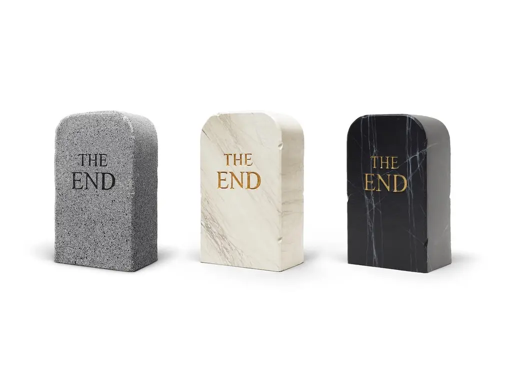 The funeral look of this furniture-sculpture is tempered by the softness of the polyurethane that makes it: in perfect Gufram tradition nothing is as it seems. "THE END in BLACK" is the most recent edition of the ironic epitaph created by Maurizio Cattelan and Pierpaolo Ferrari to establish the "end" of the Gufram brand, but also to suggest a new beginning. The new BLACK version is a Limited Edition 1/500 version in "real-fake" Marquina marble with gold writing: a noir and irreverent look that gives elegance to this tombstone that can be used as a seat with grotesque irony.Gufram pulls back from the world of design. It declares it and turns the page – with a tombstone. Since the time has come to call it quits because of the many mudslinger that have always condemned Gufram’s anti-design soul, Maurizio Cattelan and Pierpalo Ferrari celebrate the funeral rites. Thus toiletpaper writes Gufram’s epitaph, and, as an act of final resistance, creates a tombstone that can be used as a seat with a grotesque irony. THE END is born like a stone from a stone, thanks to a process of sculpting and roughing out the single elements in polyurethane foam done by artisans. The "real-fake" marble finish is made with Guflac, the special Gufram patented paint that allows the polyurethane to be made look like leather while maintaining its elasticity and softness; for this reason each tombstone is different from another. Previously, To celebrate the brand’s 50 years anniversary, in 2016 the white version in "true-fake" Carrara marble with gold writing was added to the version in "real-fake" granite created by Toiletpaper in 2014THE END is the only funeral reminder part of international collections such as the Deste Foundation and is on sale in some of the most exclusive stores and cultural institutions such as the MoMA bookshop in New York. Thanks to its biting irony, the image of THE END was chosen by Maurizio Cattelan for the cover of his autobiography.Materials:Seat of soft polyurethane, finished and decorated with Guflac.Dimensions:36 x 22 x 60 cm.NB. LANDED PRICE USA, shipments details to enquire
