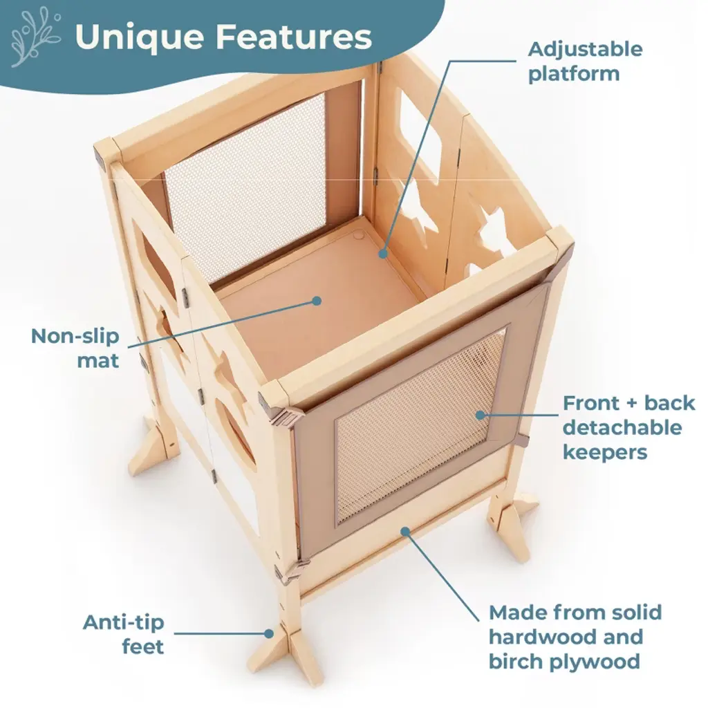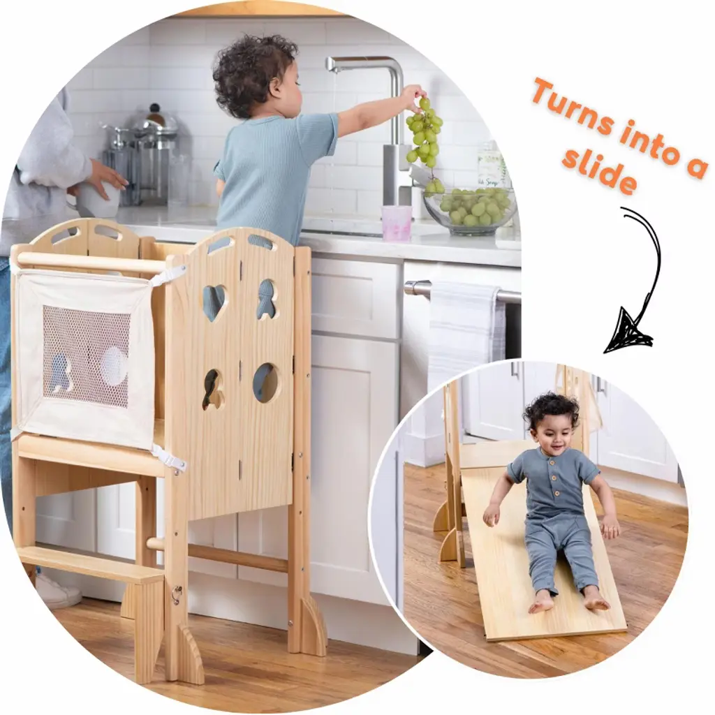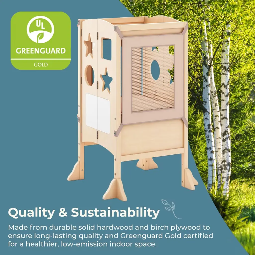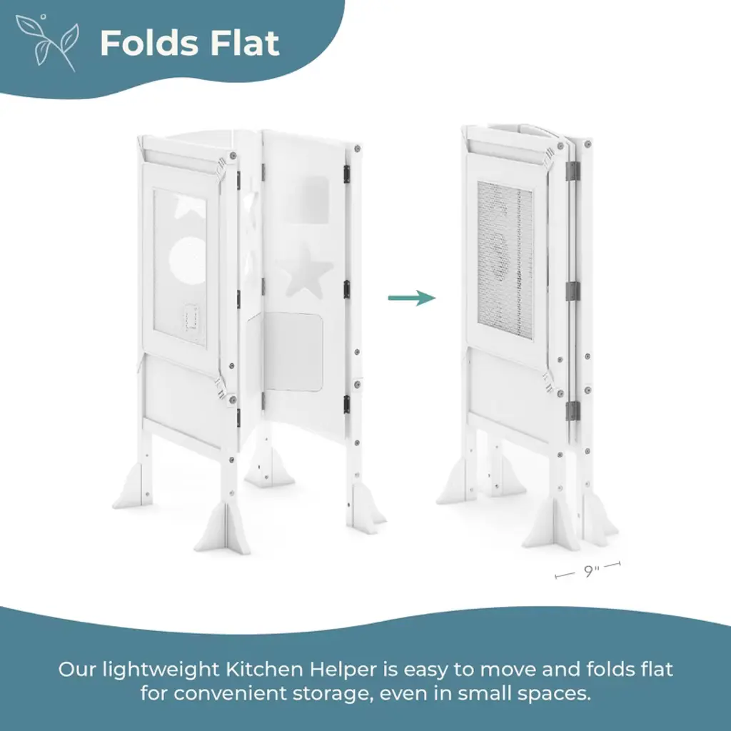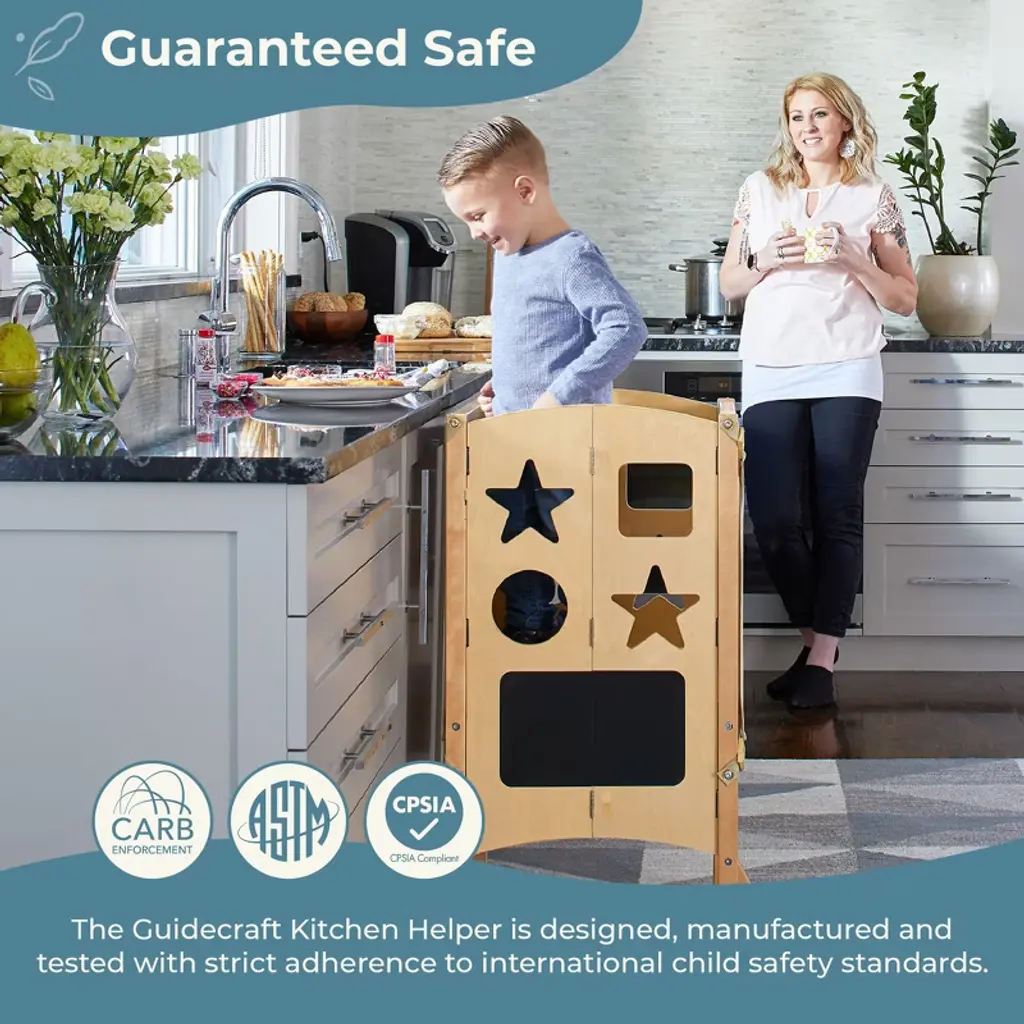Safely enjoy every moment of togetherness with the original folding Kitchen Helper Step Stool for toddlers. Encourage independence and give children access to counter height using the adjustable platform. This lightweight stool is easy to move and folds flat for convenient storage, even in small spaces. The cutout shapes and chalkboard detail make this stool playful and attractive for kids. Guidecraft Kitchen Helpers are tested to exceed child safety standards and are GREENGUARD GOLD Certified, making them the best option for your family.