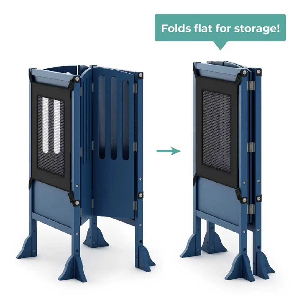 Guidecraft Contemporary Kitchen Helper Step Stool - Navy: Adjustable, Folding Kids Learning Toddler Tower With Safety Mat And Keepers