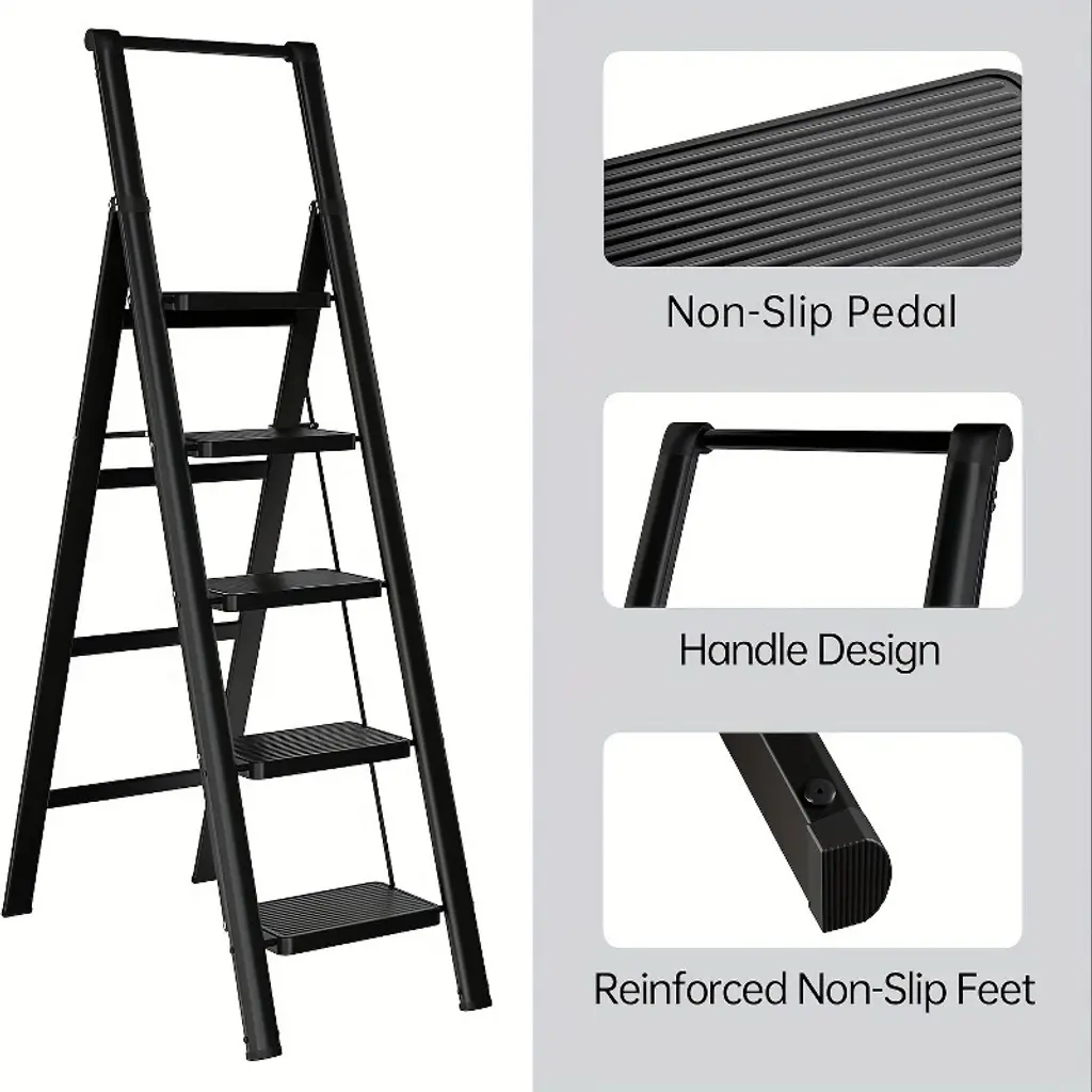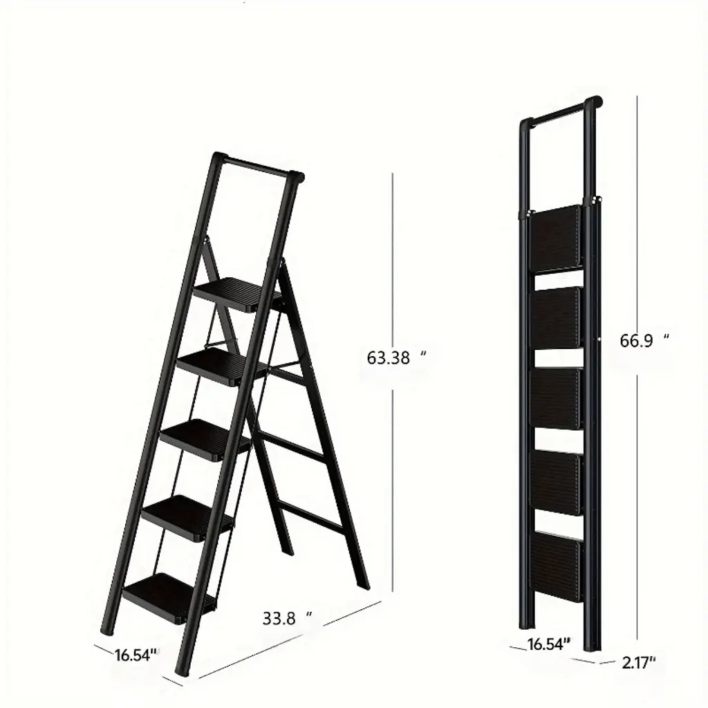 Gulches 5-step Folding Step Stool - Anti-slip Wide Pedals, Lightweight With Handle, Multi-purpose Steel Ladder For Home & Office