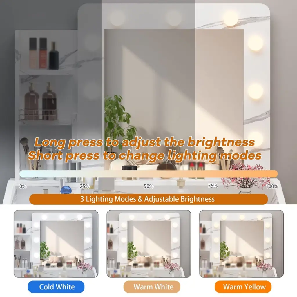 Gustowave, Vanity Desk With Mirror And Lights, Makeup Vanity With Power Outlet & Cushioned Stool, 3 Lighting Modes, Dressing Table, Marble White