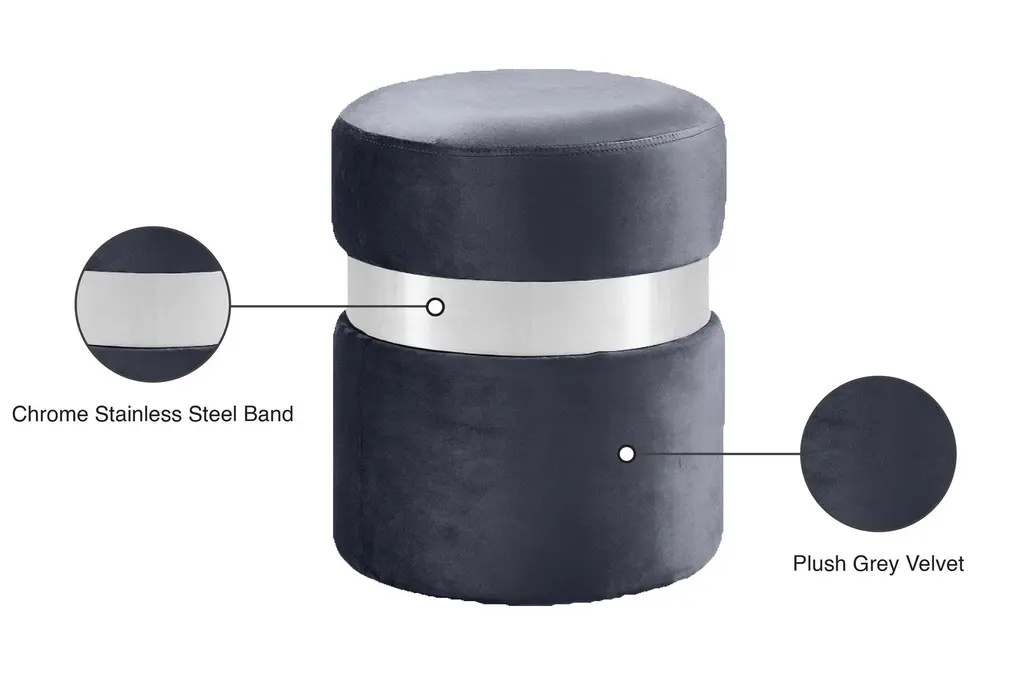 Hailey Grey Velvet Round Upholstered Ottoman / Stool | Chrome Finish