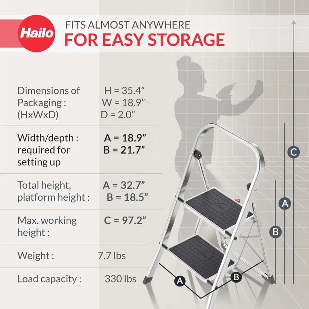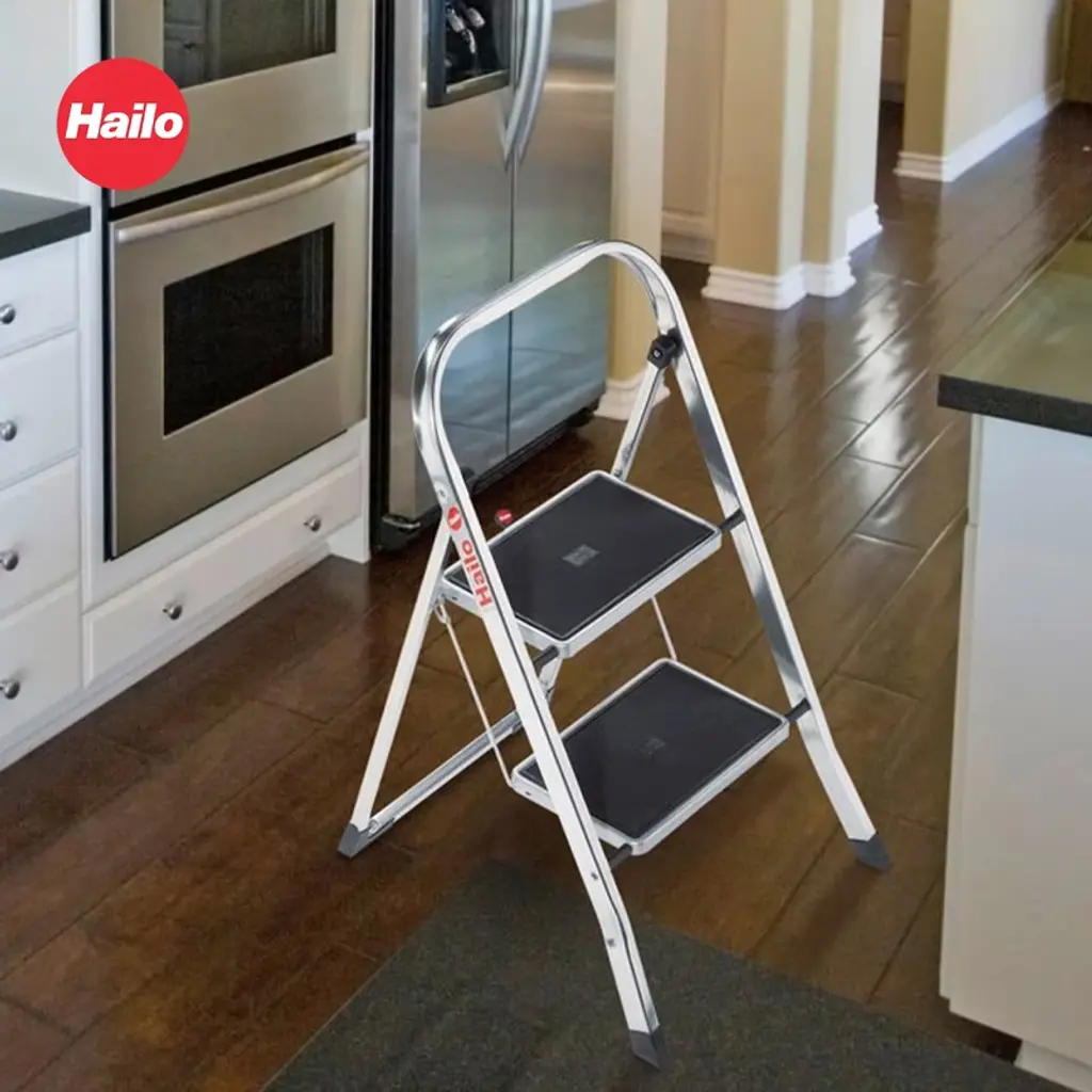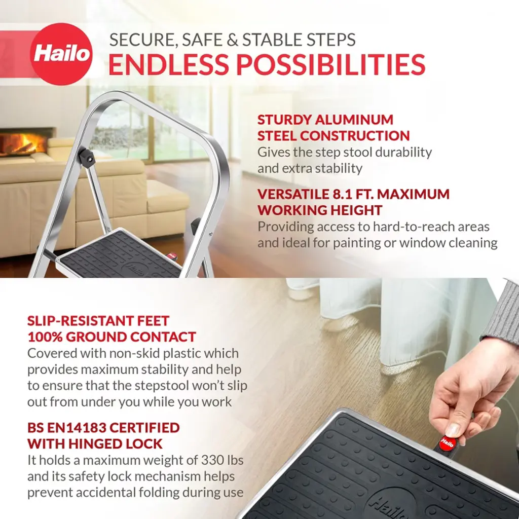 Elevate your home experience with the Hailo Household Step Stool, a versatile and durable solution designed to make your life easier. Crafted with meticulous attention to detail, this step stool combines form and function, seamlessly blending into any decor while providing unparalleled stability and safety. Crafted with a lightweight yet robust aluminum frame, the Hailo Household Step Stool is built to withstand the demands of daily use. The sturdy steel steps, finished in a sleek silver tone, offer a generous surface area and are coated with a textured, non-slip material to ensure a secure footing, even when carrying heavy loads. With a maximum weight capacity of 330 lbs, this step ladder is suitable for a wide range of users, from adults to children, making it a versatile addition to any household. One of the standout features of the Hailo Household Step Stool is its exceptional space-saving design. Whether you need to access high shelves, reach into the depths of your closet, or lend a helping hand during household chores, this step stool can be conveniently tucked away when not in use, freeing up valuable floor space. The Hailo Household Step Stool is not just a practical tool, but also a testament to German engineering excellence. Featuring non-skid feet, this building supply step stool provides maximum stability, preventing the stool from slipping or sliding, even on slippery surfaces. Versatile and adaptable, the Hailo Household Step Stool can be used in a variety of settings, from the kitchen and bathroom to the garage and workshop. Its compact size makes it an ideal companion for tight spaces, while its sturdy construction allows it to handle tasks ranging from reaching high shelves to assisting with home maintenance and DIY projects.