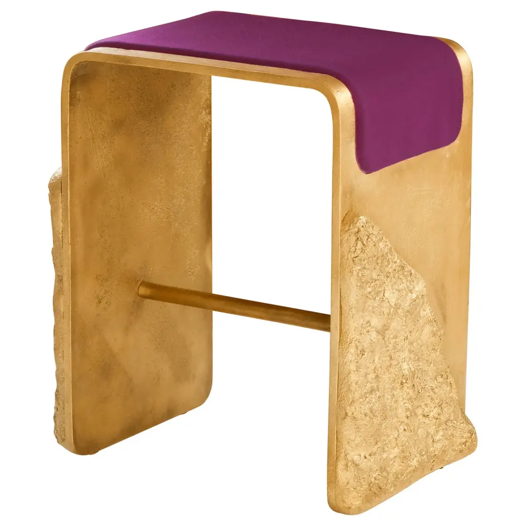 Handcrafted Stool in Cast Brass and Red Upholstery by Joana TeixeiraDimensions: D 28 x W 30 x H 47 cm.Materials: Cast brass and upholstery.Available in red and violet upholstery. Please contact us. Joana Teixeira was born in Oporto and graduated in industrial design. From very early she realized that her path would be to express emotions through objects.Joana started her career in jewelry to fulfill her taste for detail, however, she felt that her curiosity for the processes and the desire for new challenges needed to be expanded, later embarking on industrial design. Obsessed by emotions and with extreme sensitivity, she seeks to transmit the restlessness with which she observes the world through her pieces. Creating a close relationship between object and user, mixing the creative process with production, material, form, and purpose.Aesthetically seeks the harmonization of the senses, having as premises the attention to detail, sobriety, subtleness, and longevity, inspiring and absorbing the chaotic beauty of the world.