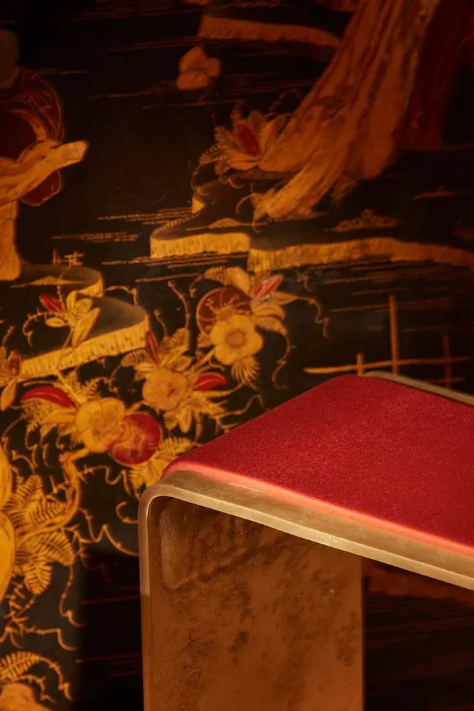 Handcrafted Stool In Cast Brass And Red Upholstery By Joana Teixeira