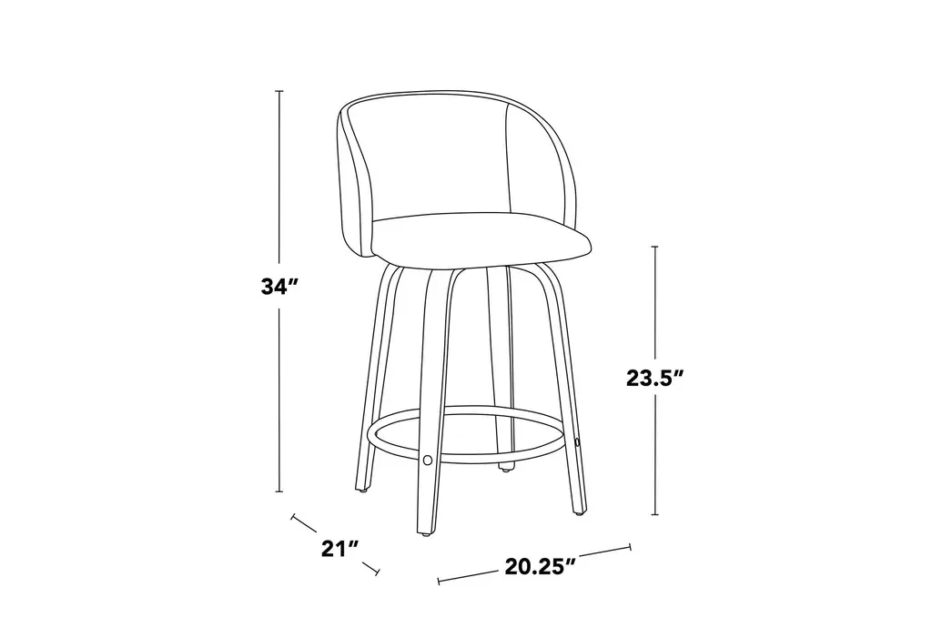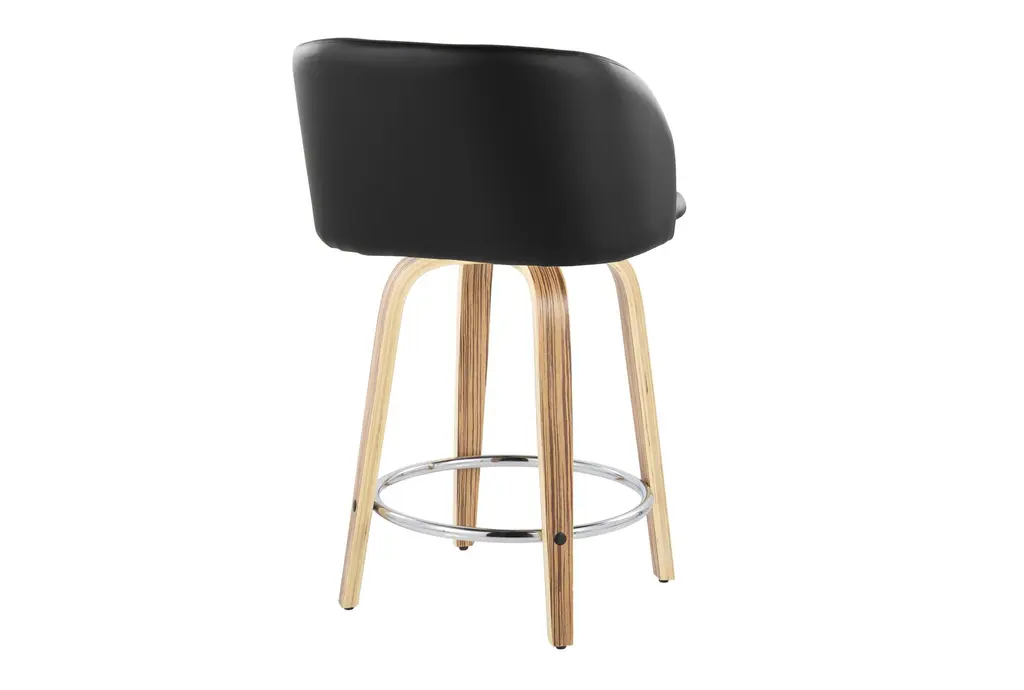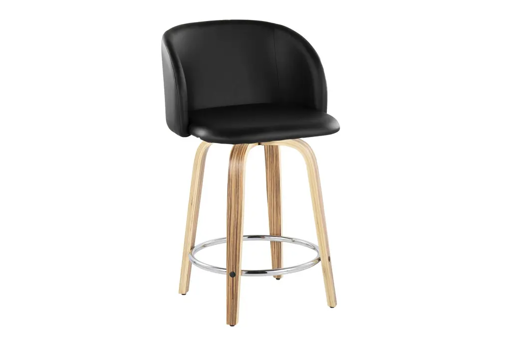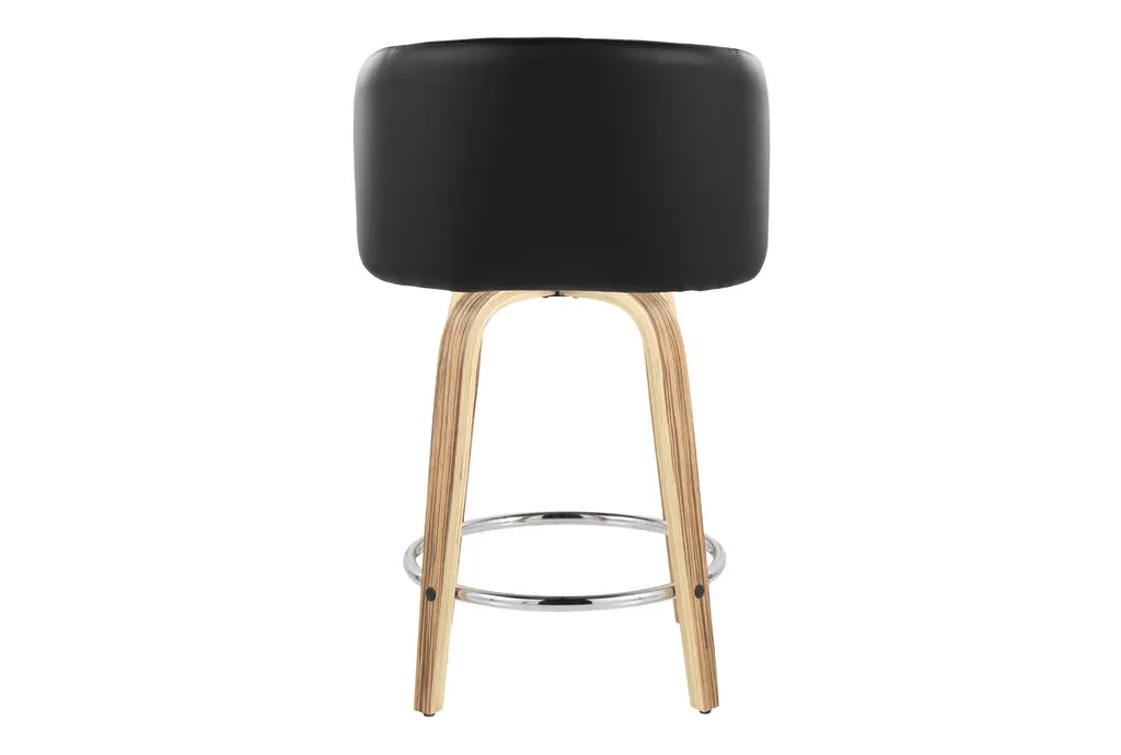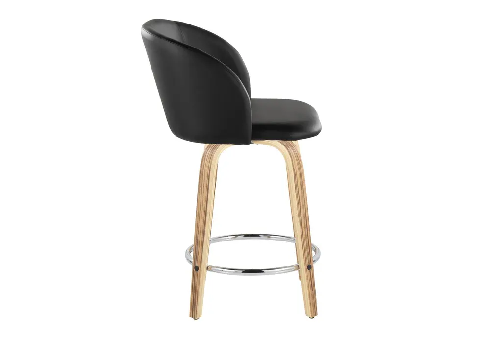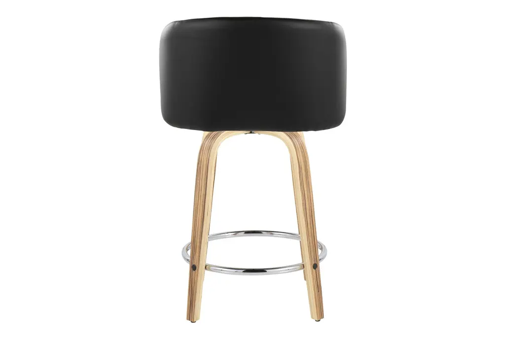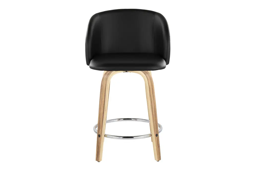 Hanne 24" Counter Height Stool With Swivel brings contemporary comfort to your dining room by pairing a curved, armless seat upholstered in black faux leather with zebra wood tapered legs. The padded seat offers cloud-like comfort while a 360-degree swivel and a round chrome metal footrest make it easy to move and rest your feet during long meals. Offered as a set of 2, these counter-height stools tuck neatly under most counters and islands for efficient use of space. Durable materials and a balanced profile make them a practical choice for everyday dining and casual entertaining.