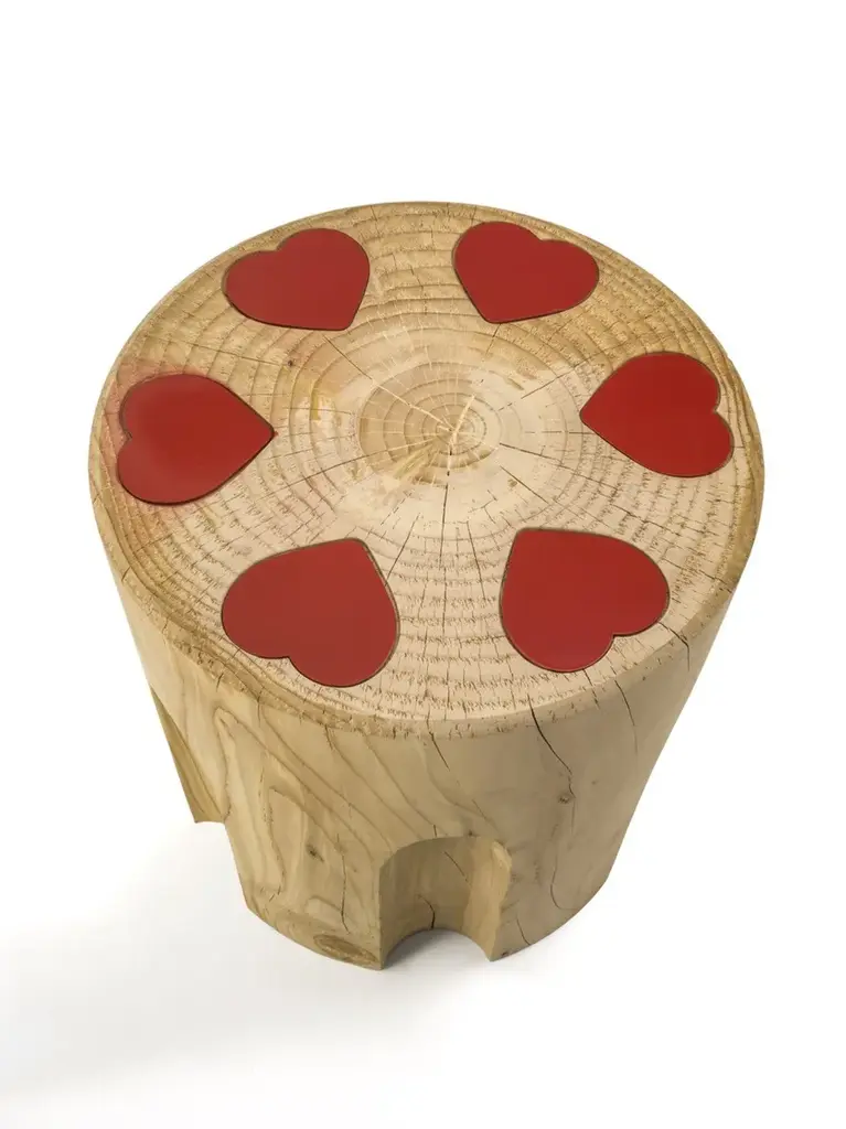 Sparacuori is a stool in solid, scented cedar, made in a single block, a symbolic representation of the cylinder of a revolver that, instead of harmful bullets, shoots romantic red hearts. The products are made from completely natural wood hand-finished without the addition of any treatment. Movements, cracks and changes in the appearance of the wood are intrinsic characteristics of these items and result from the natural settlement and diverse environmental conditions.AVAILABLE FINISHESA7: cedarA9: cedar contract finish, vulcano cedarB2: lacquered iron: irondust, RAL (only selected colours)