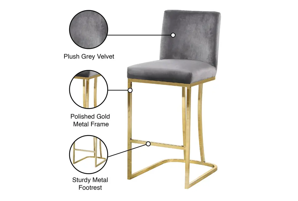 The Heidi Grey Velvet Upholstered Stool with Gold Finish is the perfect addition to your modern dining room or kitchen. Its armless design provides a sleek and comfortable seating option, while the plush velvet upholstery adds a touch of luxury. The gold-finished metal sled base offers stability and a contemporary flair.