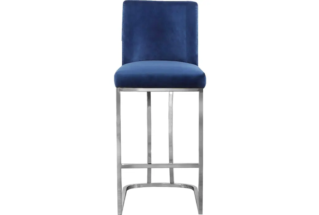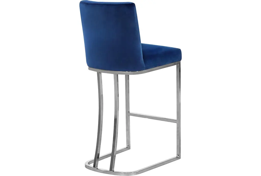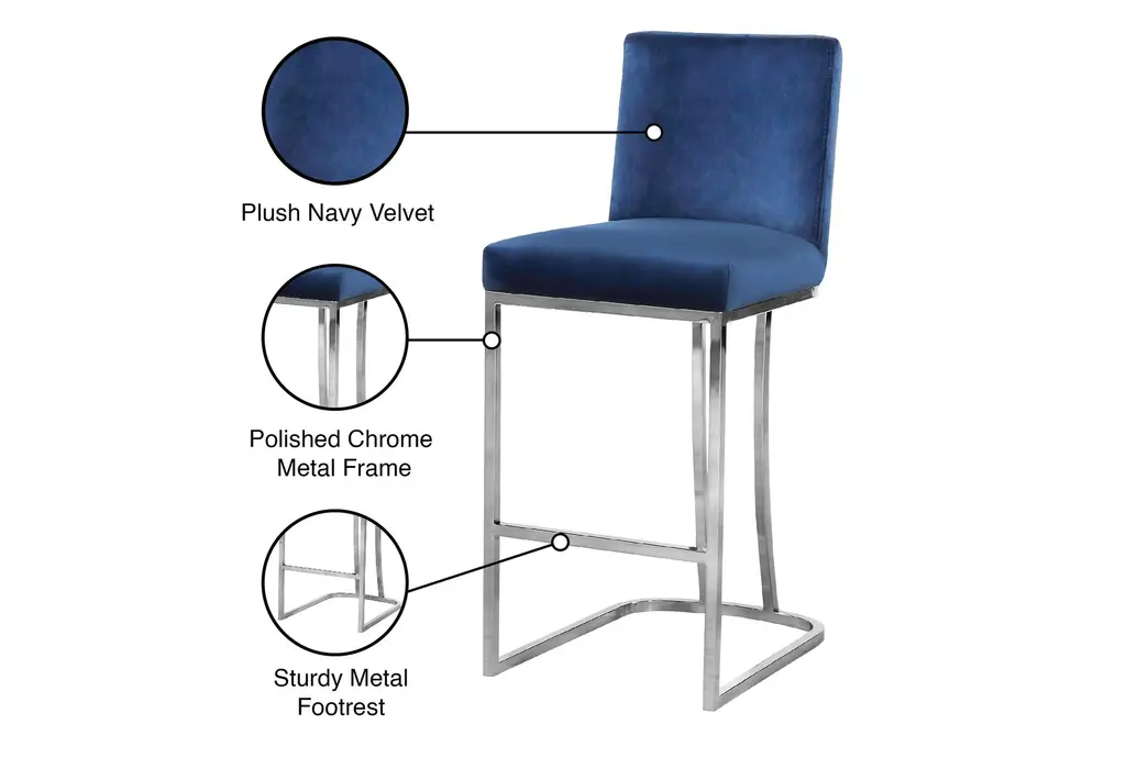 The Heidi Navy Velvet Upholstered Stool with Chrome Finish is a perfect blend of modern design and luxurious comfort. Its rich navy velvet upholstery offers a soft and plush seating experience, while the chrome finish metal legs provide a sturdy and stylish support. Ideal for dining rooms, kitchens, or any food prep and serving space, this stool will add both functionality and a touch of sophistication to your home.