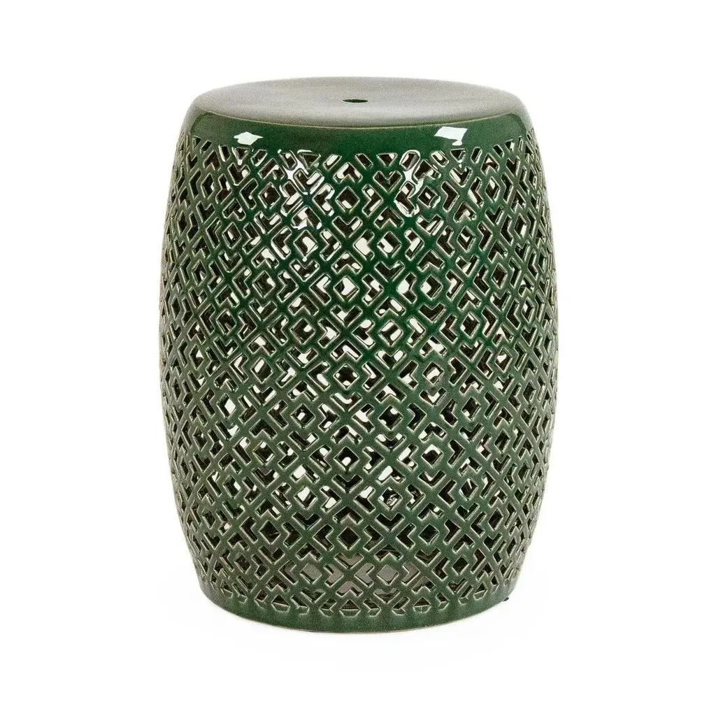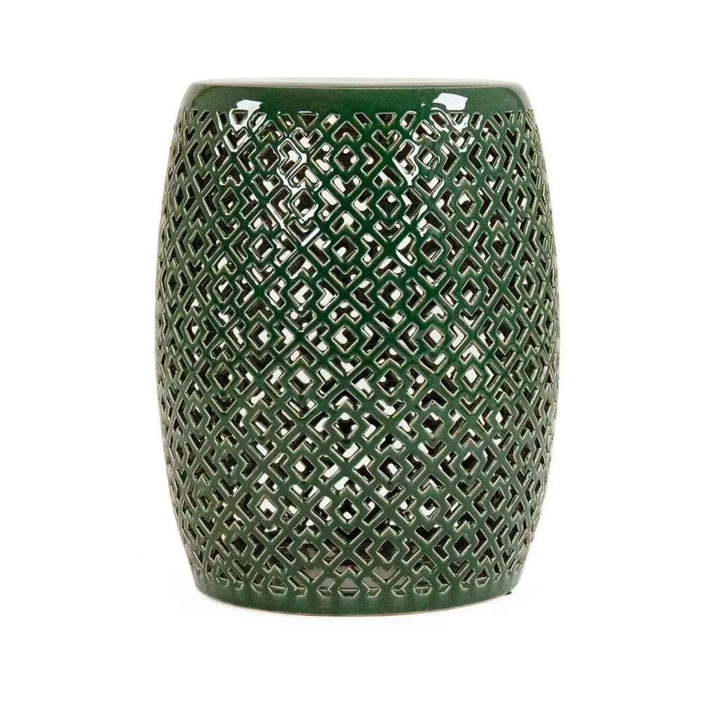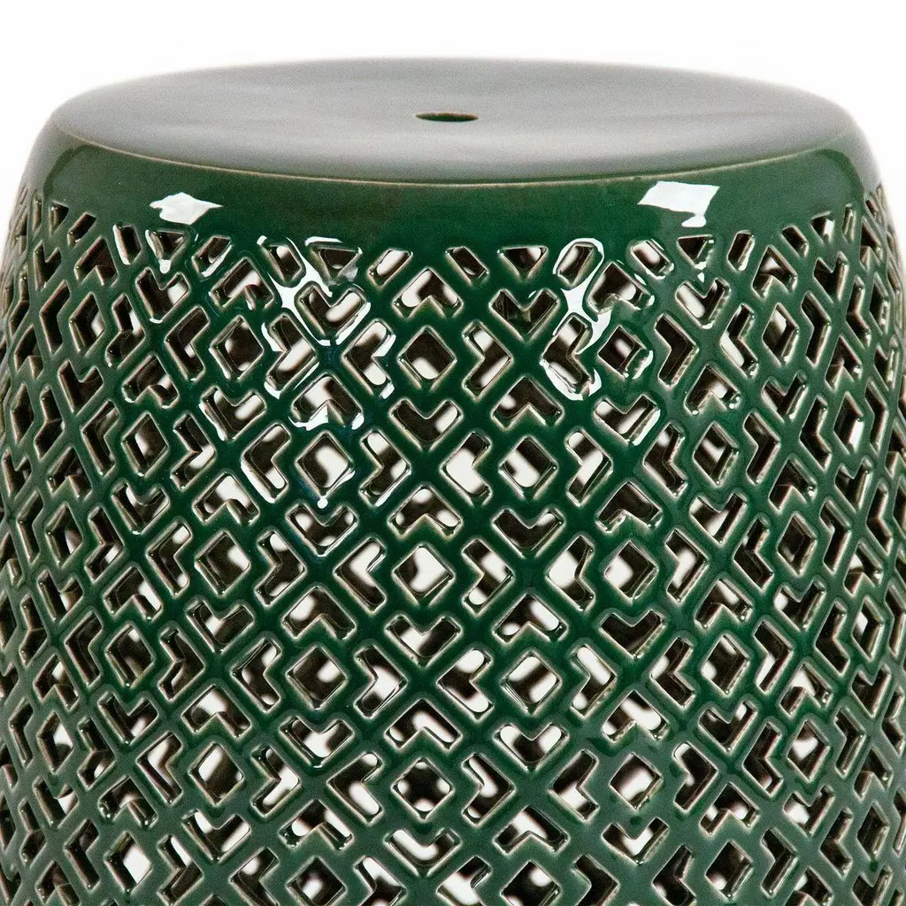 The Lorin Garden Stool is a cylindrical stool finished in refined teal glaze intricateley adorned with multiple geometric openings.