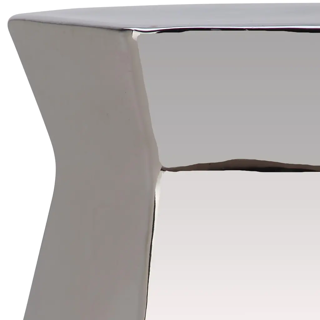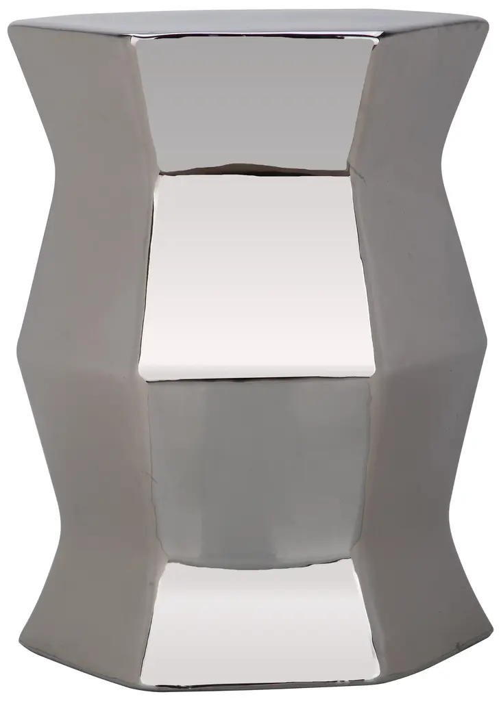 Form and function live in harmony in the Modern Hexagon indoor-outdoor garden stool. Though it looks like modern art for the porch or living rooms, it's sculptural shape is crafted of glazed ceramic in plated silver, and it serves as either seat or table. Wipe with damp cloth. Avoid the use of chemicals and household cleaners as they may damage the finish. Suitable for outdoor use, avoid extreme temperature and store indoors during long periods of inclement weather.