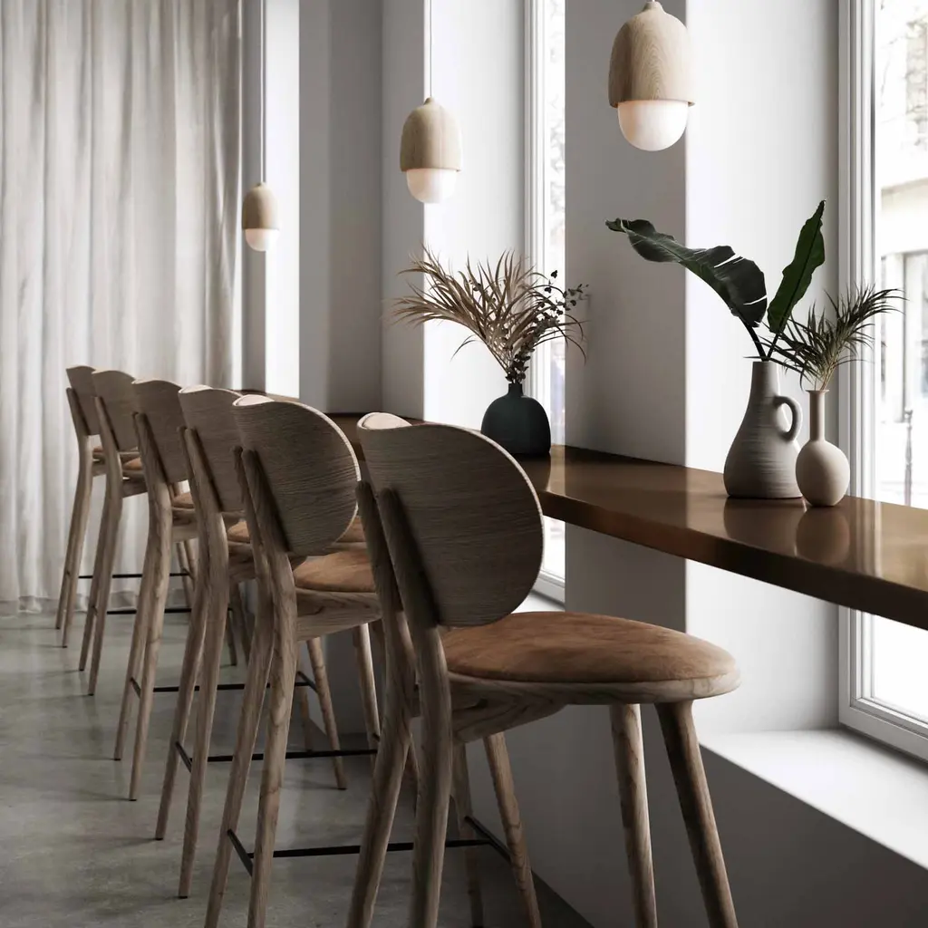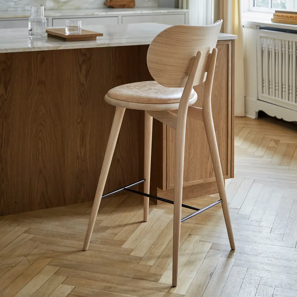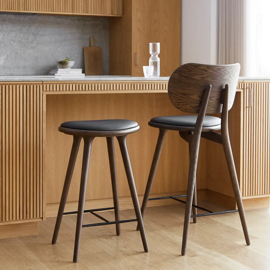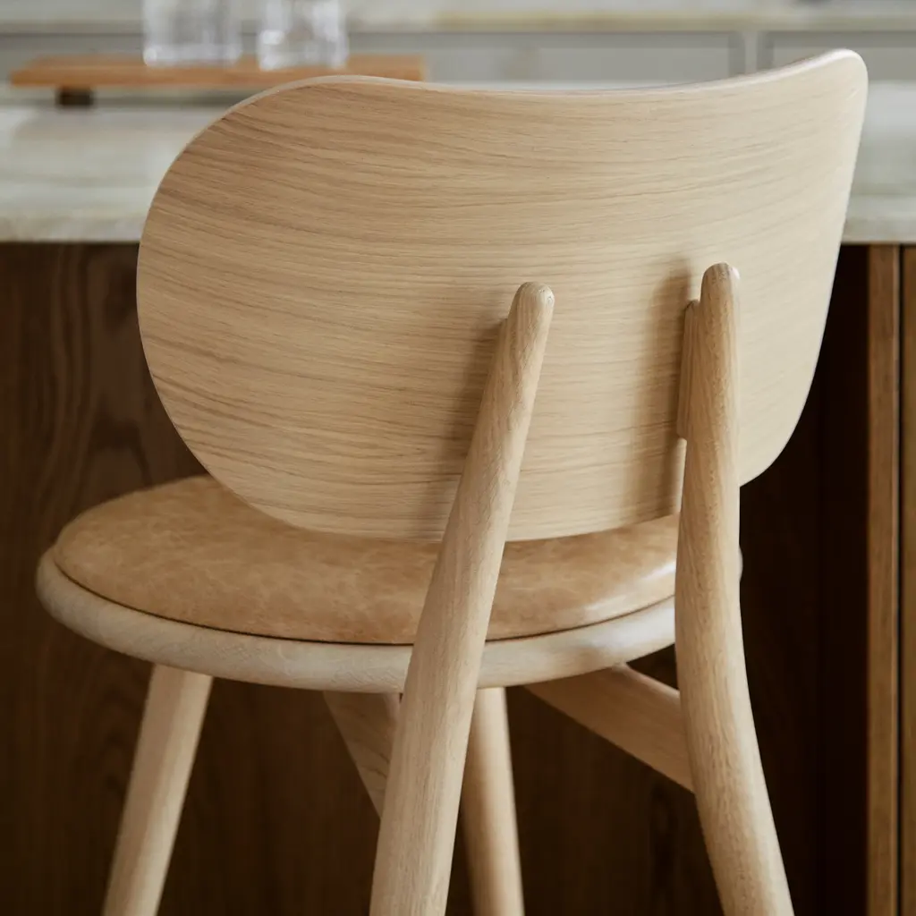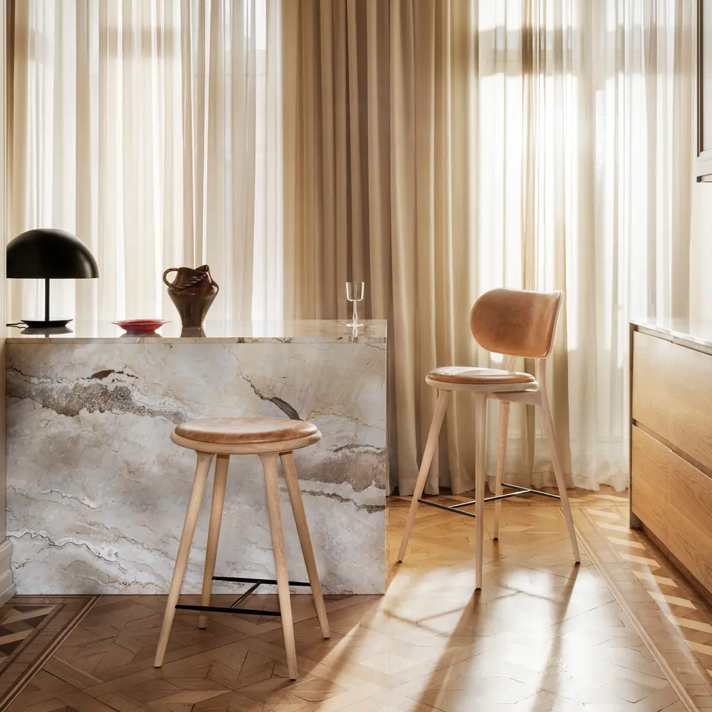 Space Copenhagen adds a generously rounded backrest for a heightened sense of comfort to its original high stool that’s an &Tradition mainstay. To match the seat, the back is upholstered in soft durable leather and is fully supportive and even outweighs the need for an armrest. Available in certified sustainably sourced solid oak or beech with the steam-bent veneer backrest, it’s equally at home in residential and hospitality settings.