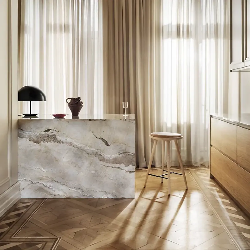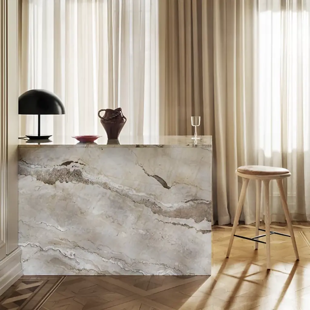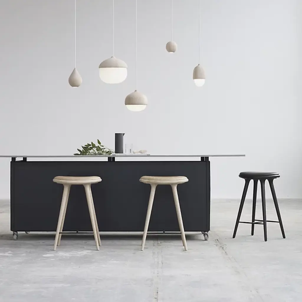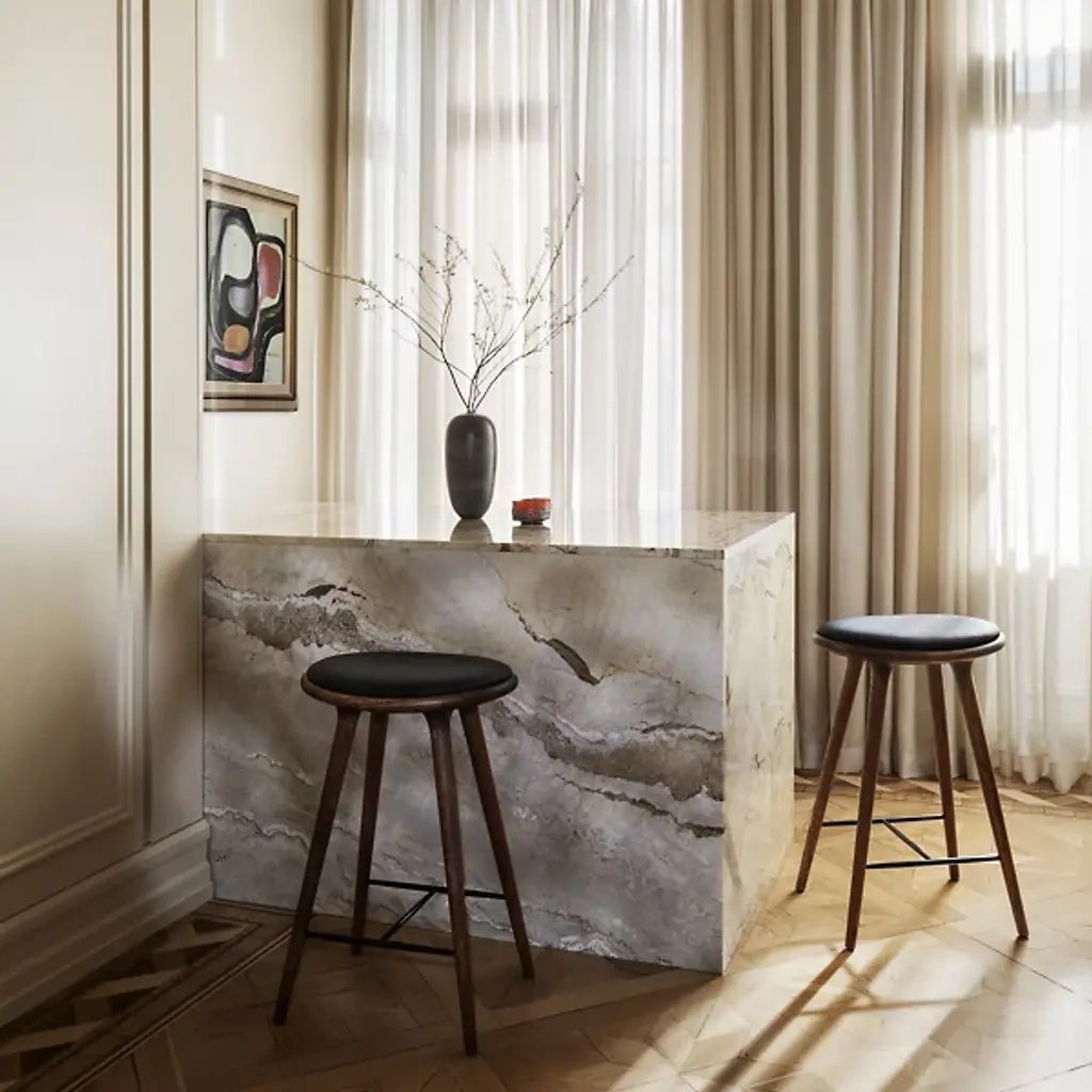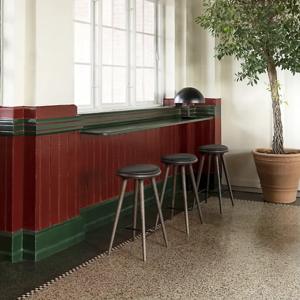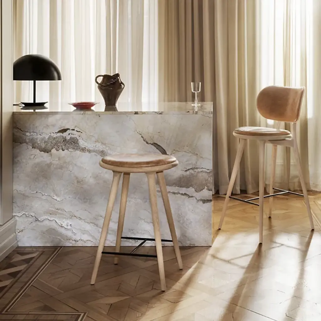 The Mater High Stool - Premium Edition improves on the clean, organic lines of the original High Stool with the intricate grain of solid oak. The FSC-Certified wood is coated in a water-based stain that lets the grain pattern show through--and enhances it. The base is topped with a supple seat of genuine leather.