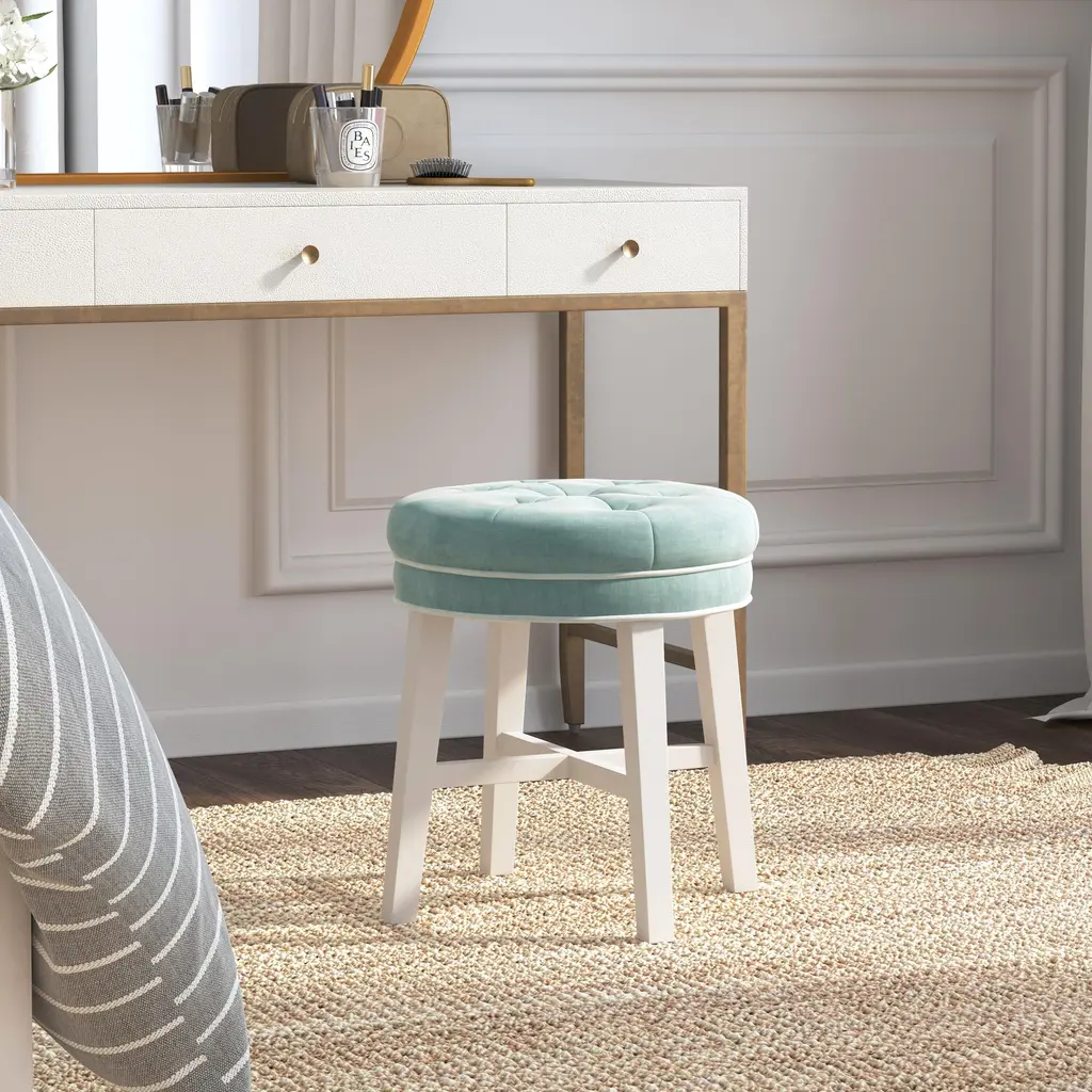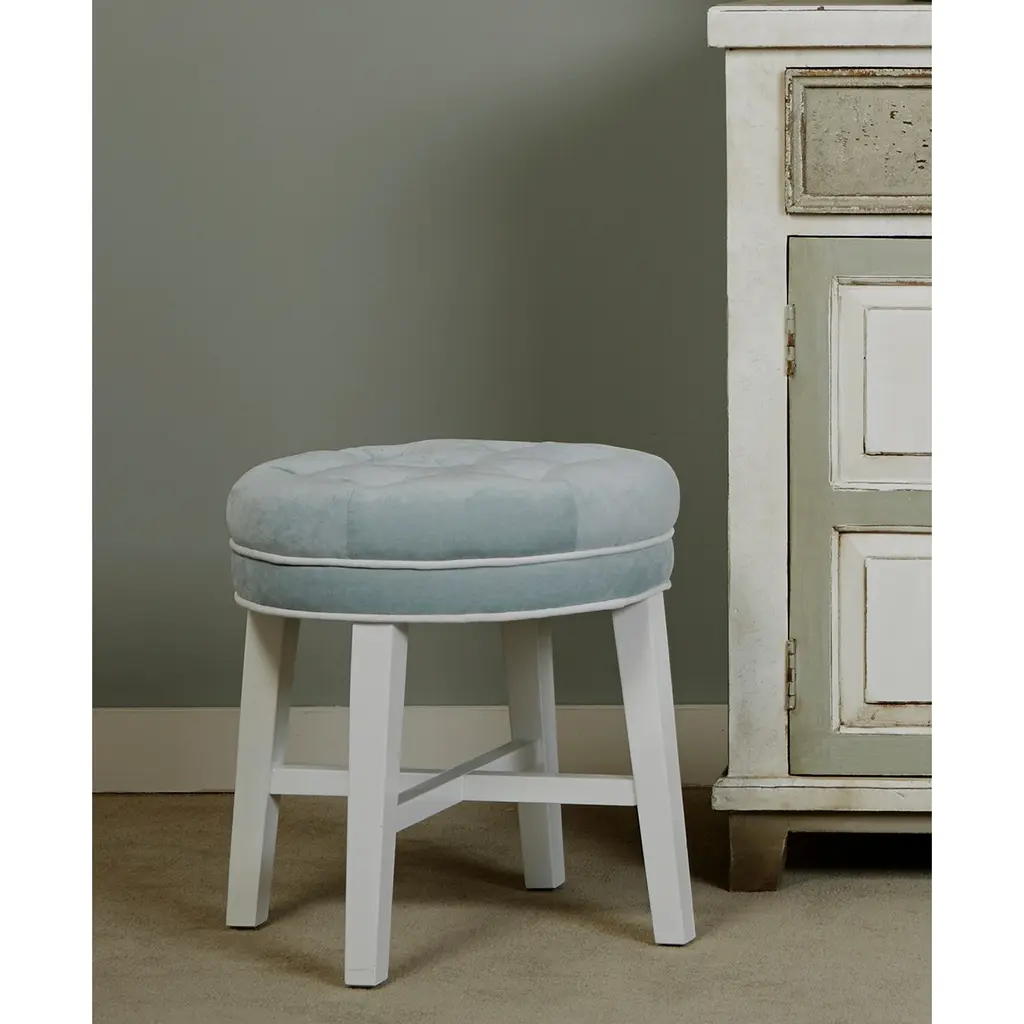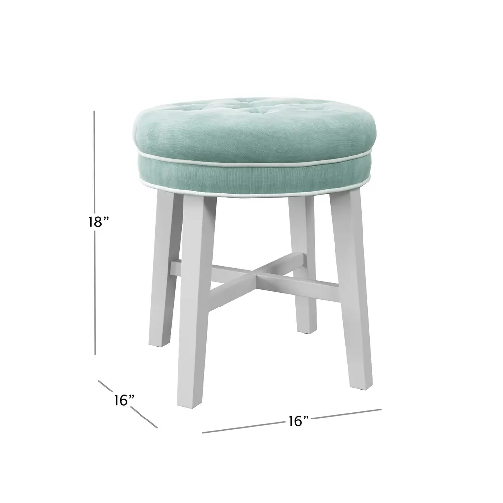 Traditional charm comes together with trendy design to create an adorable modern vanity stool perfect for any home. Tufted spa blue polyester upholstery and contrast stitching detail adds pop to this backless upholstered vanity stool. White finish brushed over rubberwood legs gives a light, airy feel to a petite, cute-as-a-button profile. Sturdy X-shaped stretcher and world-class construction will make the durable and dainty round vanity stool stay strong for years to come. Perfect as a vanity stool, ottoman, or additional seating anywhere in the house. Easy to assemble.