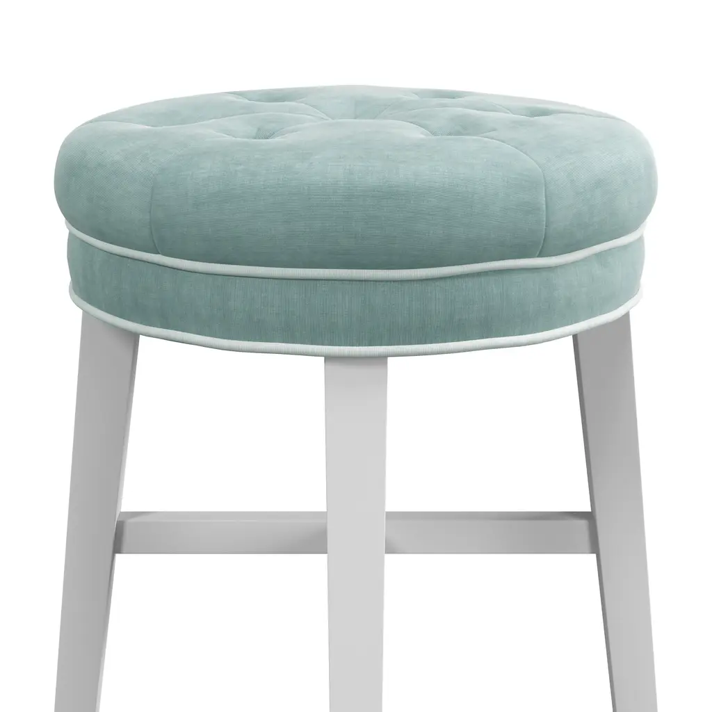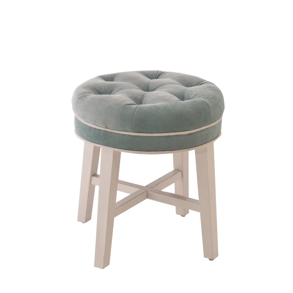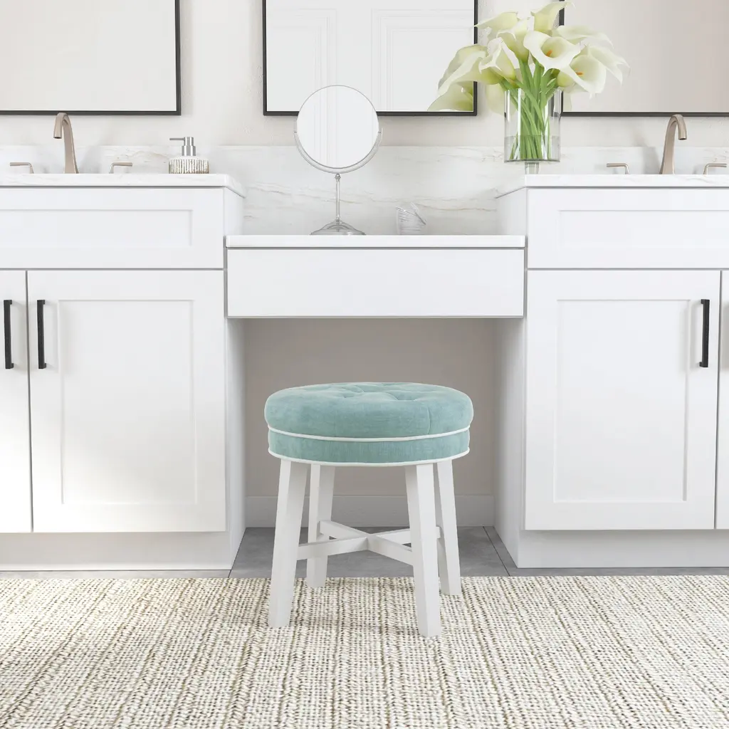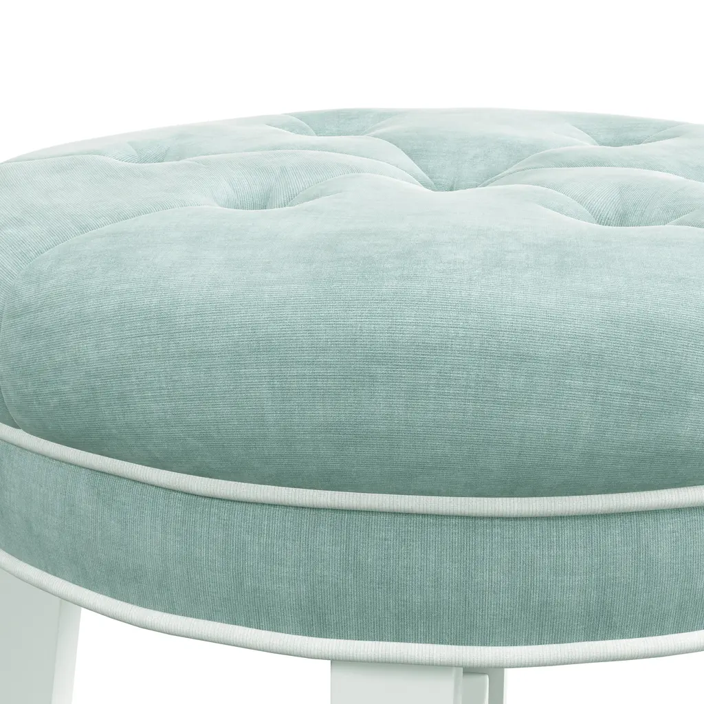 Traditional charm comes together with trendy design to create an adorable modern vanity stool perfect for any home. Tufted spa blue polyester upholstery and contrast stitching detail adds pop to this backless upholstered vanity stool. White finish brushed over rubberwood legs gives a light, airy feel to a petite, cute-as-a-button profile. Sturdy X-shaped stretcher and world-class construction will make the durable and dainty round vanity stool stay strong for years to come. Perfect as a vanity stool, ottoman, or additional seating anywhere in the house. Easy to assemble.