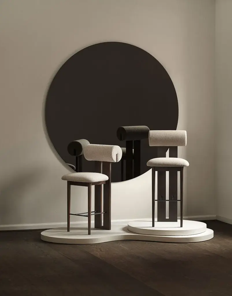 Hippo is a fabric stool with oak structure.Soft, playful shapes characterise this family of upholstered pieces, the Hippo makes a stylish statement in any interior setting. The Hippo series is influenced by the Hippopotamus mammal drawing upon its barrel-shaped torsos. The characteristic wooden profile comes in four different FSC certified oak finishes; natural, light smoked, dark smoked and black and the seat and back come in variety of upholstery options. Available in a wide variety of fabrics, leathers and COM/COL. Different upholsteries can have different appearances and some fabrics may wrinkle slightly around the curved seat. Seat made of Plywood and Cut Foam. Backrest made of Massive Oak and Cut Foam.