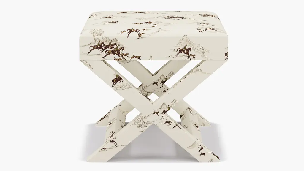 Hand upholstered in the UK with classical studding and hand polished solid beech legs, ideal for an extra seat or a centre piece in a living room.