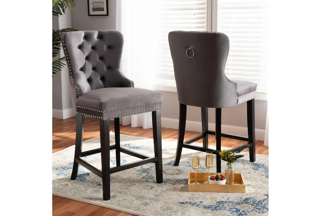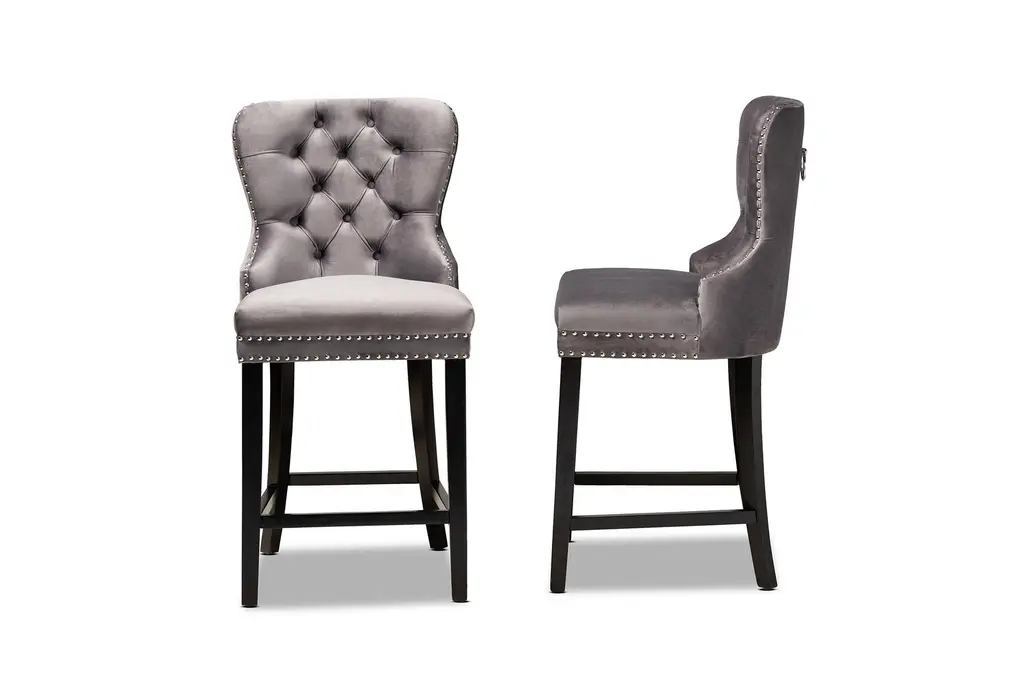Introducing the Howell Modern Grey Velvet Upholstered Dark Brown Wood Square 26" Counter Height Stool Set Of 2. These stools are designed in a mid-century modern style, perfect for adding a touch of sophistication to your dining room or kitchen. The grey velvet fabric and espresso brown rubberwood legs create a striking contrast, while the tufted detailing adds a touch of luxury.