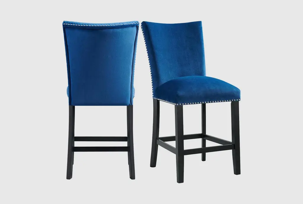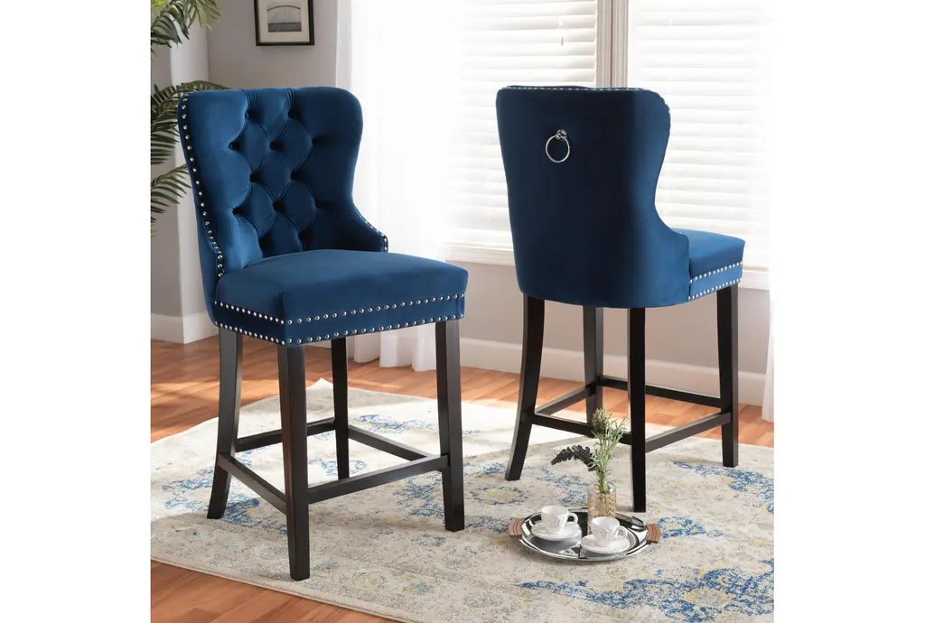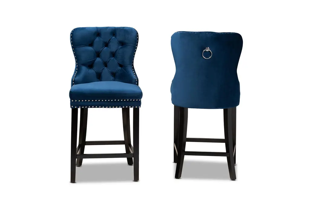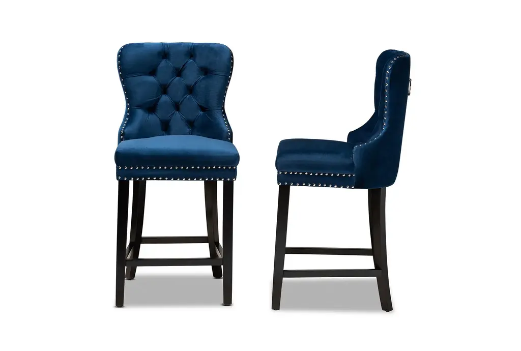 Upgrade your dining or kitchen area with the Howell Modern Navy Blue Velvet Upholstered Dark Brown Wood Square 26" Counter Height Stool Set Of 2. These stools feature a stunning navy blue velvet upholstery that adds a touch of sophistication to any space. The dark brown rubberwood legs provide sturdy support and a beautiful contrast to the rich velvet fabric.