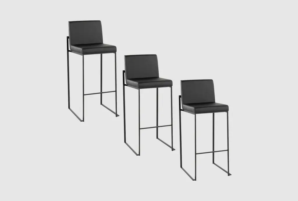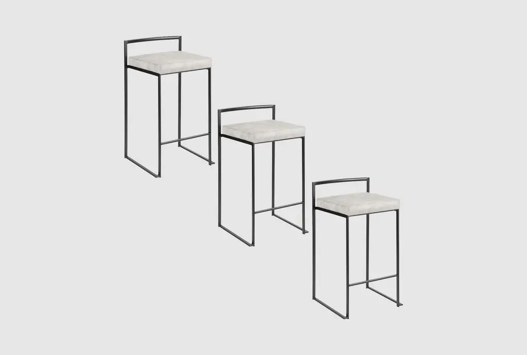 The Ian White 26" Stackable Faux Leather + Black Metal Frame Counter Height Stool Set of 3 offers a stylish and practical seating solution for your dining room or kitchen. Featuring a modern design, these armless stools are perfect for minimalistic spaces. The faux leather upholstery and black metal frame provide durability and a contemporary look.