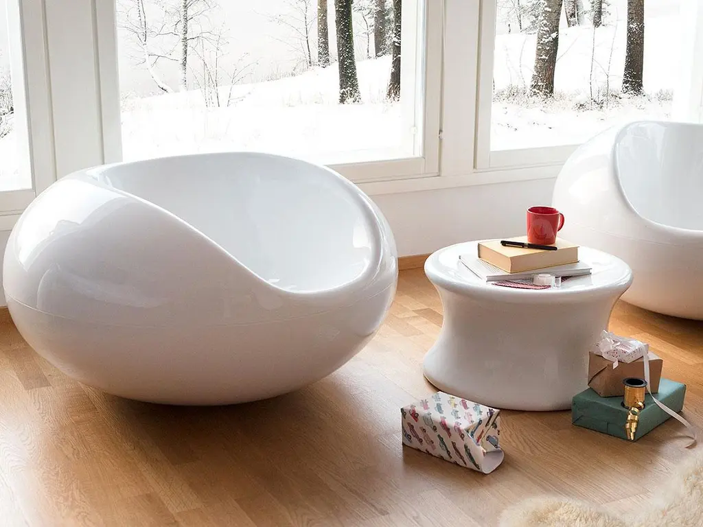 He Mushroom is one of Eero’s oldest designs and in its fibreglass form is part of the same design family that includes the ball chair, Pastil and Tomato. It can be used as a stool or a small table. The fibreglass Mushroom was designed in 1967 by Eero Aarnio.