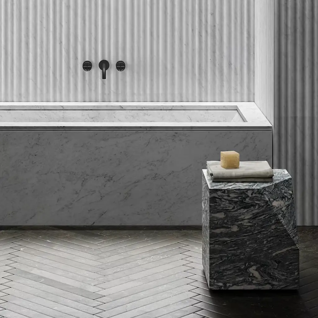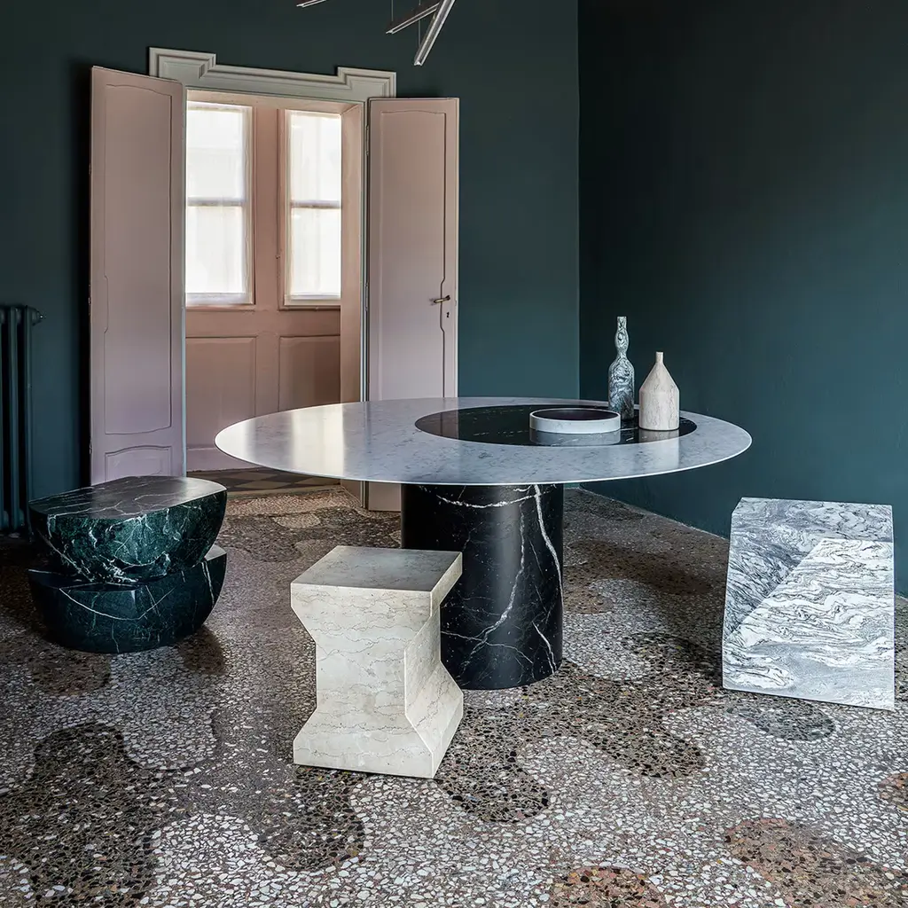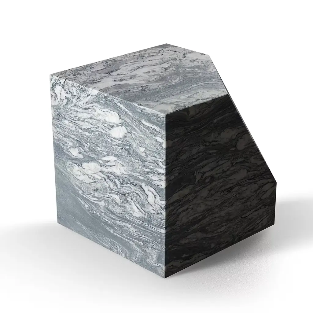 The Ikona Stool, which can also be used as a side table, is the result of the keen eye of designer Elisa Ossino. The stool is sculpted into an unconventional three-dimensional geometric form. Suitable for both indoor and outdoor use, the stool has small wheels to allow for easy movement. Also available in Giallo Egiziano, Rosa Perlino and Verde Guatemala stones.