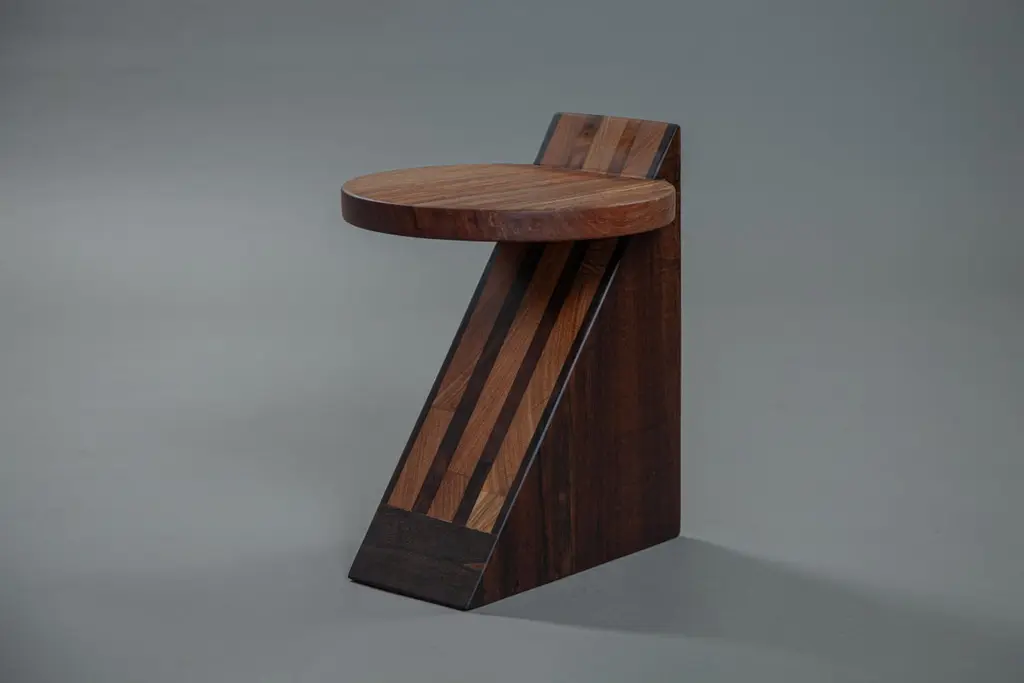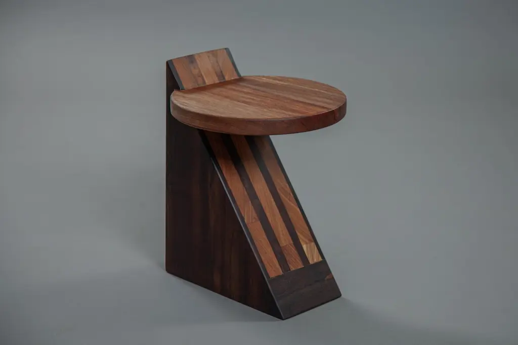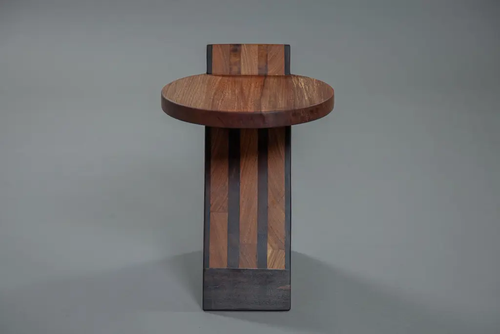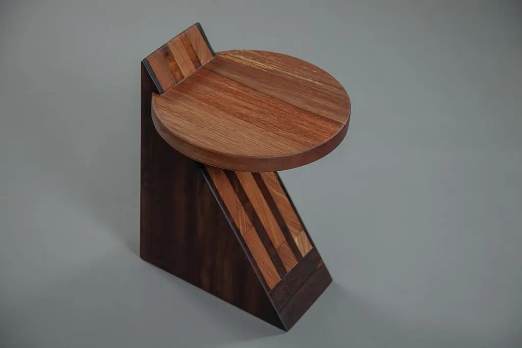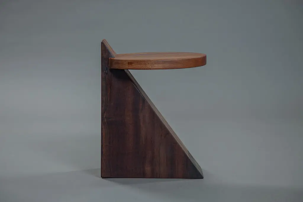 The Inácio stool plays with geometric shapes, aiming to create a sensation of movement and fluidity. It is made entirely from leftover solid wood from other projects, which would normally be discarded. Can also be used as a side or coffee table. As they are natural materials, wood, straw and leather may have different tones and textures than those shown in the photos.
