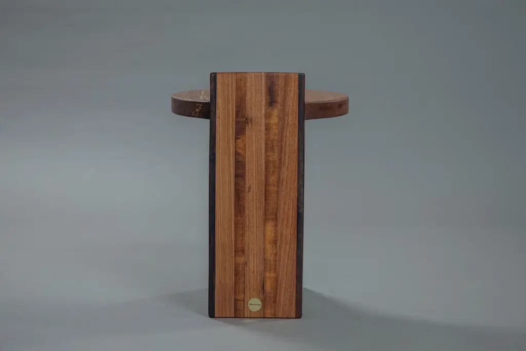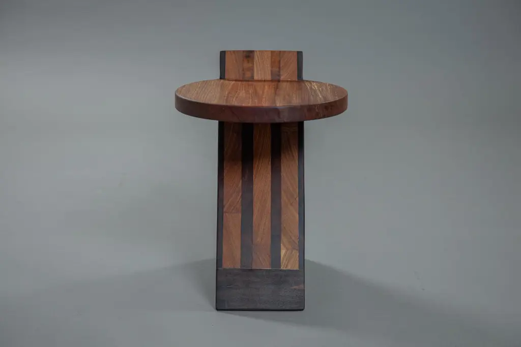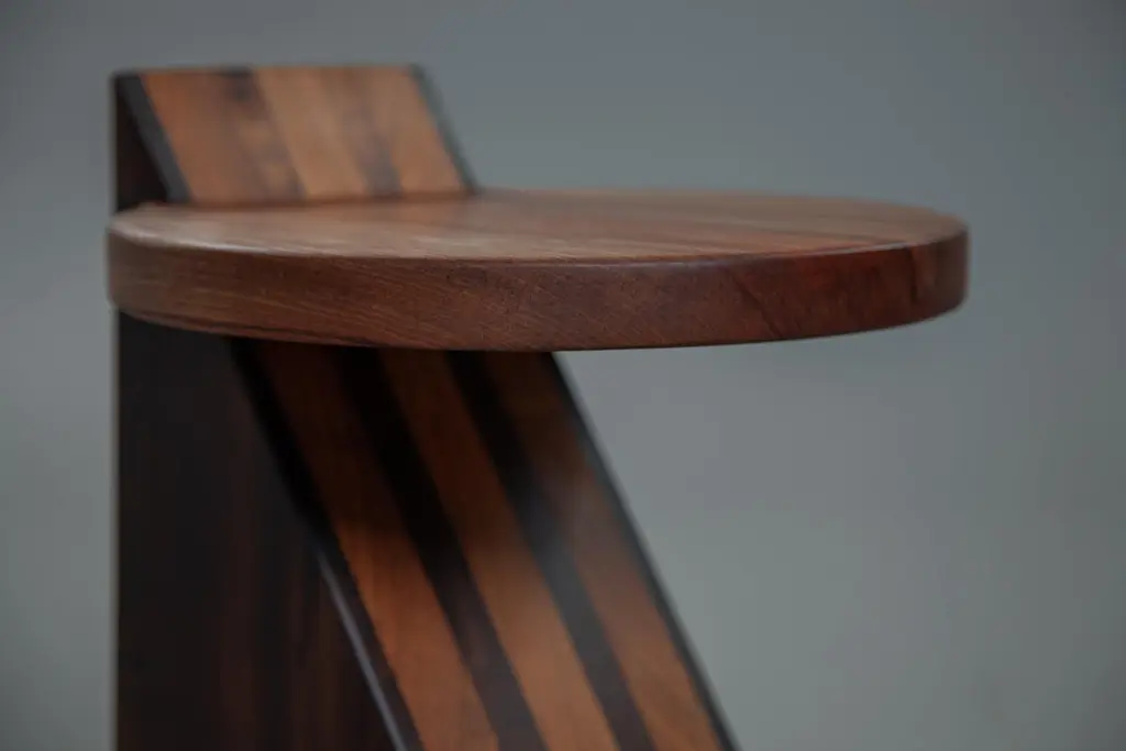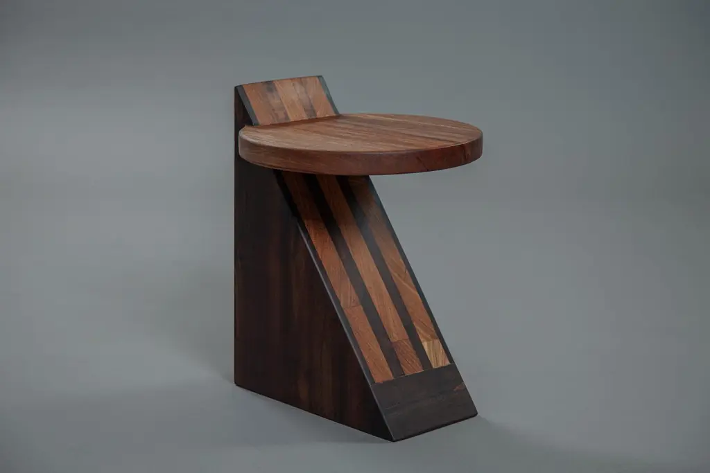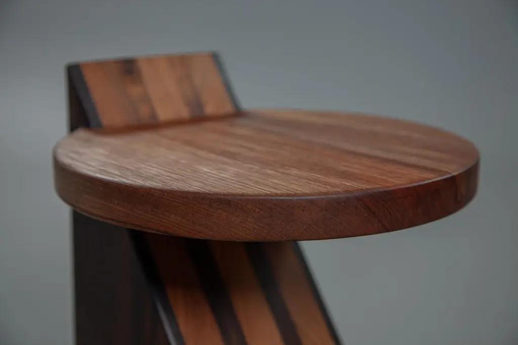 The Inácio stool plays with geometric shapes, aiming to create a sensation of movement and fluidity. It is made entirely from leftover solid wood from other projects, which would normally be discarded. Can also be used as a side or coffee table. As they are natural materials, wood, straw and leather may have different tones and textures than those shown in the photos.