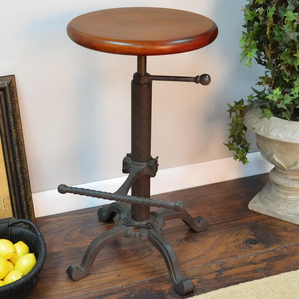 This handsome Wood and Metal Stool is full of vintage charm, and it's more than up to the task of providing a comfortable seat. Crafted from sustainable mango wood, the seat is treated with a rich chestnut stain. The sturdy hand-forged metal frame has a textured, gray powder-coated finish for distinctive style and long life. Support is provided by four sturdy feet, and a spiraled metal rod provides a resting place for your own feet. The threaded seat post allows the seat height to adjust from 22½" up to 30" by spinning it around. The stool also features a locking mechanism to keep the stool at your desired height.