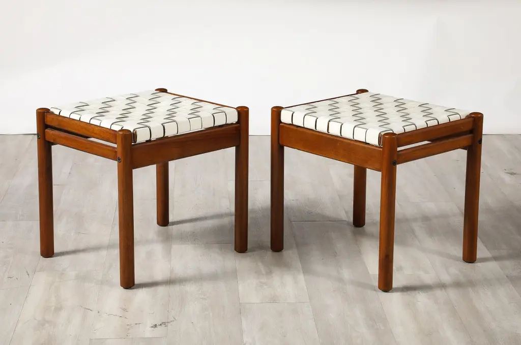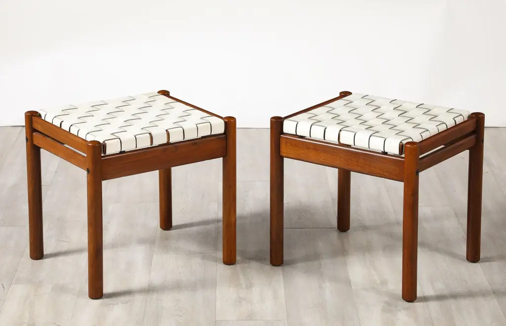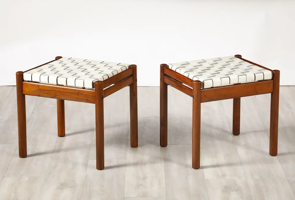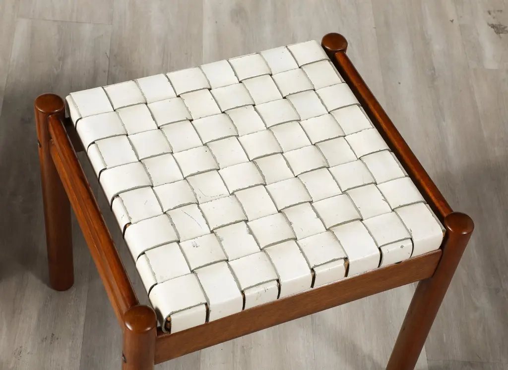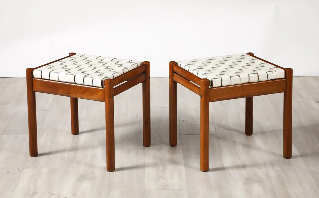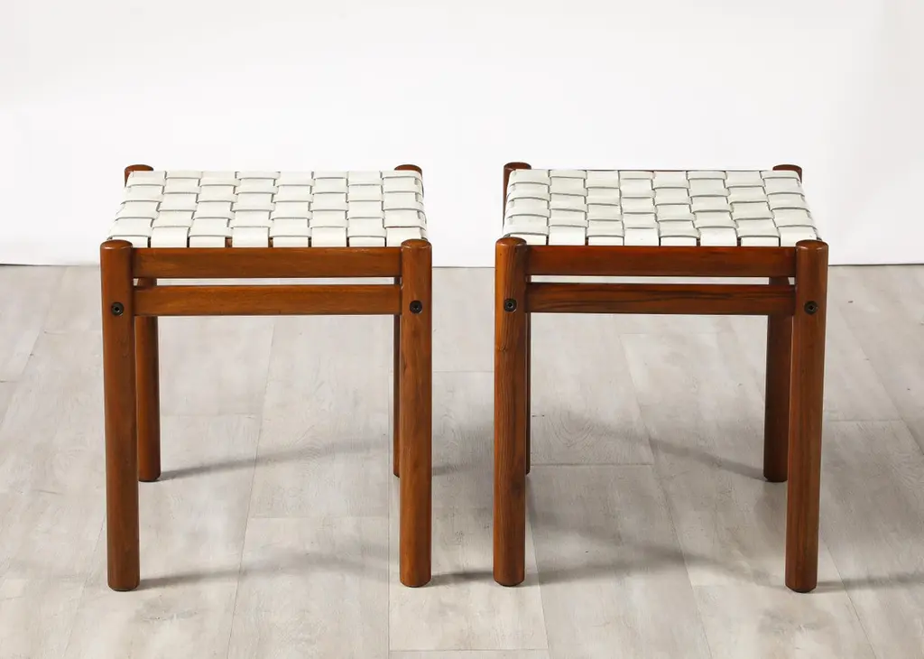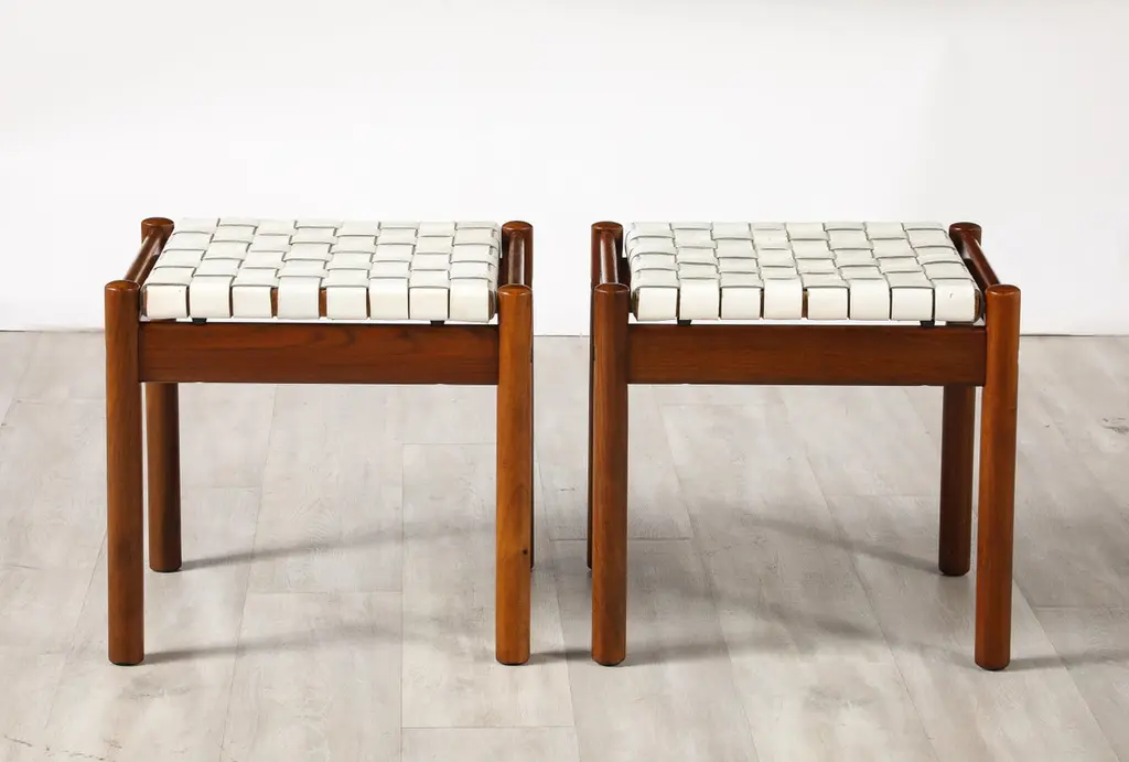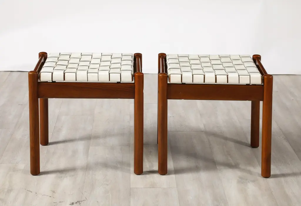 Italian 1960's Walnut Stools With Woven Leather Seats
