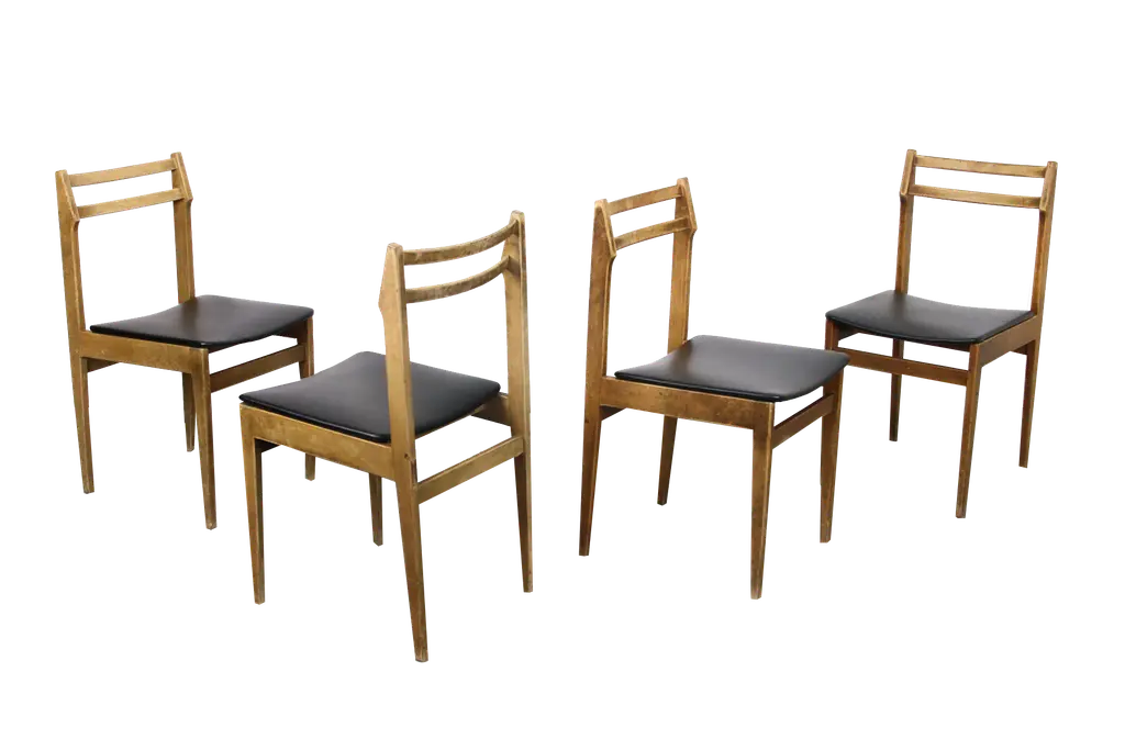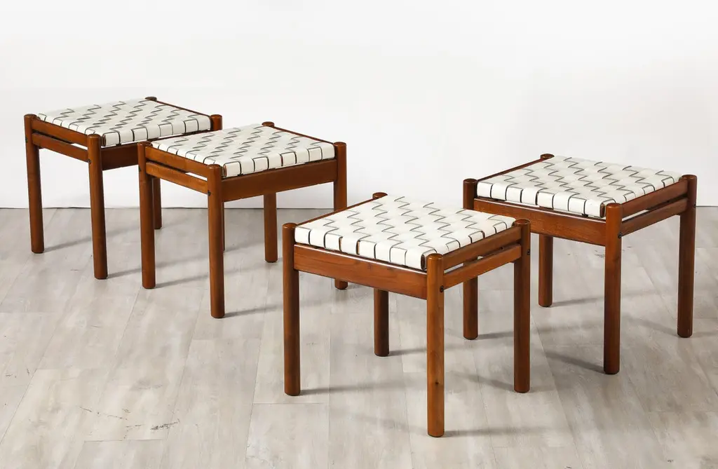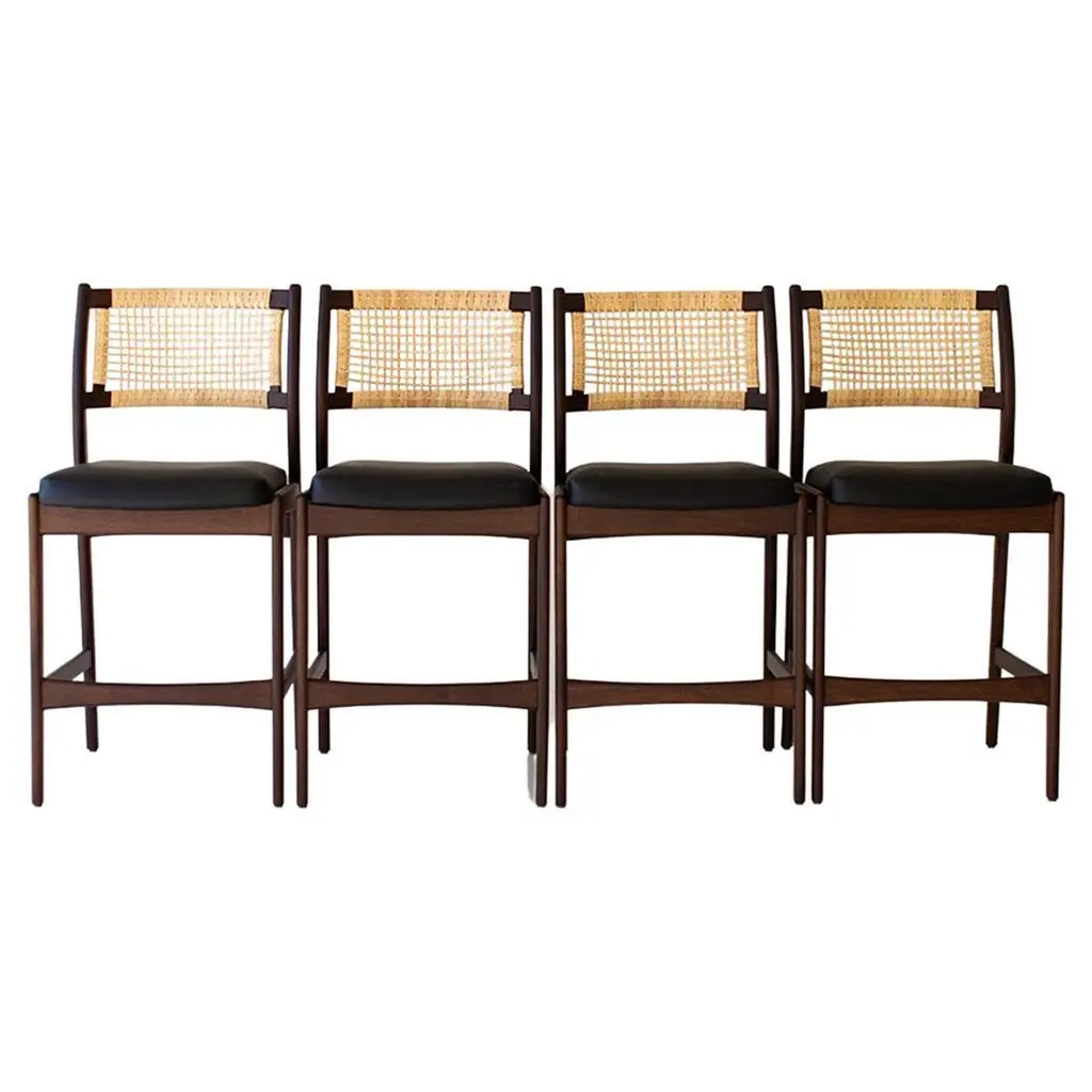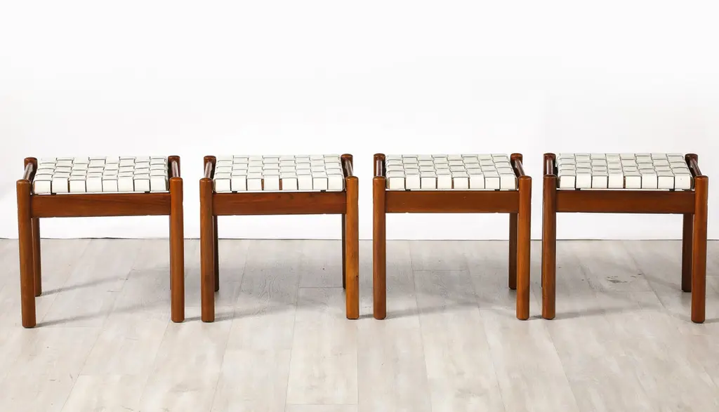 Italian 1960's Walnut Stools with Woven Leather Seats; with stylish rounded legs. Four available. $1,850 each Italy, circa 1960 Size: 17 1/4" high x 18 3/4" wide x 16" deep