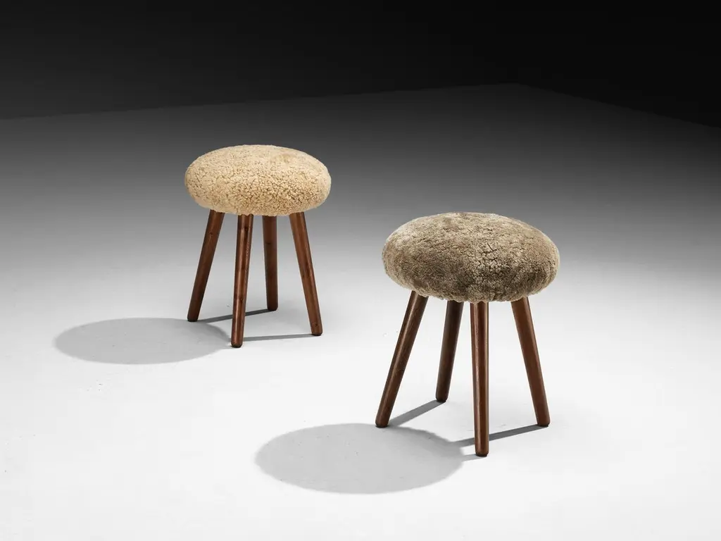 Stools, pine, sheepskin, Italy, 1960sCharming set of stools made in Italy during the 1960s. Constructed from solid pine wood, these pieces showcase simplicity and pure design, emphasizing natural materials and clean lines. The sheepskin adds a soft touch. The sturdy build and timeless aesthetic make them versatile additions to any interior, whether used as seating, side tables, or decorative elements. Their understated charm highlights the beauty of craftsmanship and the elegance of midcentury Italian design.Please note that the depicted photographs of the stools show the final result of what the item will look like after reupholstery. The price on offer is valid for this final result, including fabric and labor. The reupholstered item has a current lead-time of twelve to fourteen weeks and will be performed by our experienced craftspeople in our in-house restoration atelier. All to meet our high-quality and standards. For further questions please contact our design specialists regarding reupholstery and specific lead-time.