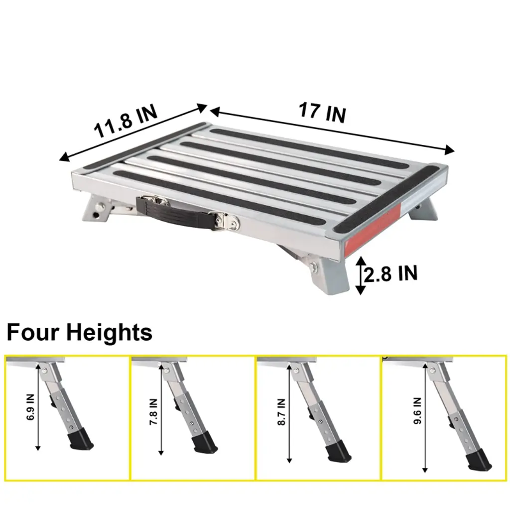 Looking for a reliable and versatile step stool? Our adjustable folding platform step is the perfect solution. Crafted from lightweight yet durable aluminum, it weighs only 5.4 pounds but can support up to 1000 pounds. The foldable ladder legs can be adjusted to four height settings, making it adaptable to different needs. The surface is covered with non - slip gripper strips, and thickened rubber feet provide a strong grip. Reflective strips on three sides ensure visibility at night, enhancing safety. It's portable with a side handle for easy transportation and can be stored in a small space. Whether you're in an RV, SUV, or at home in the kitchen, this step stool is a must - have for reaching high places with ease.