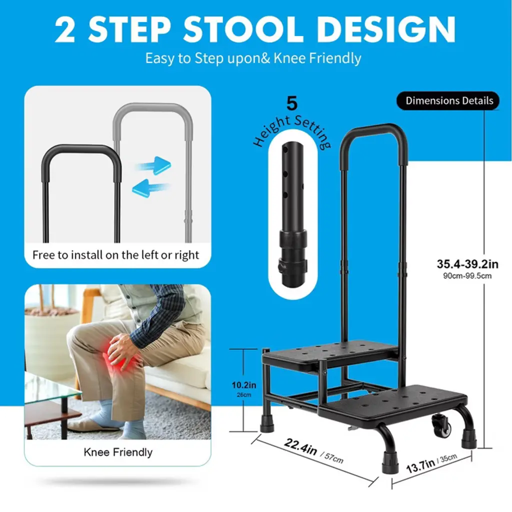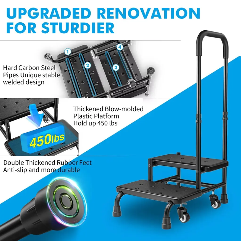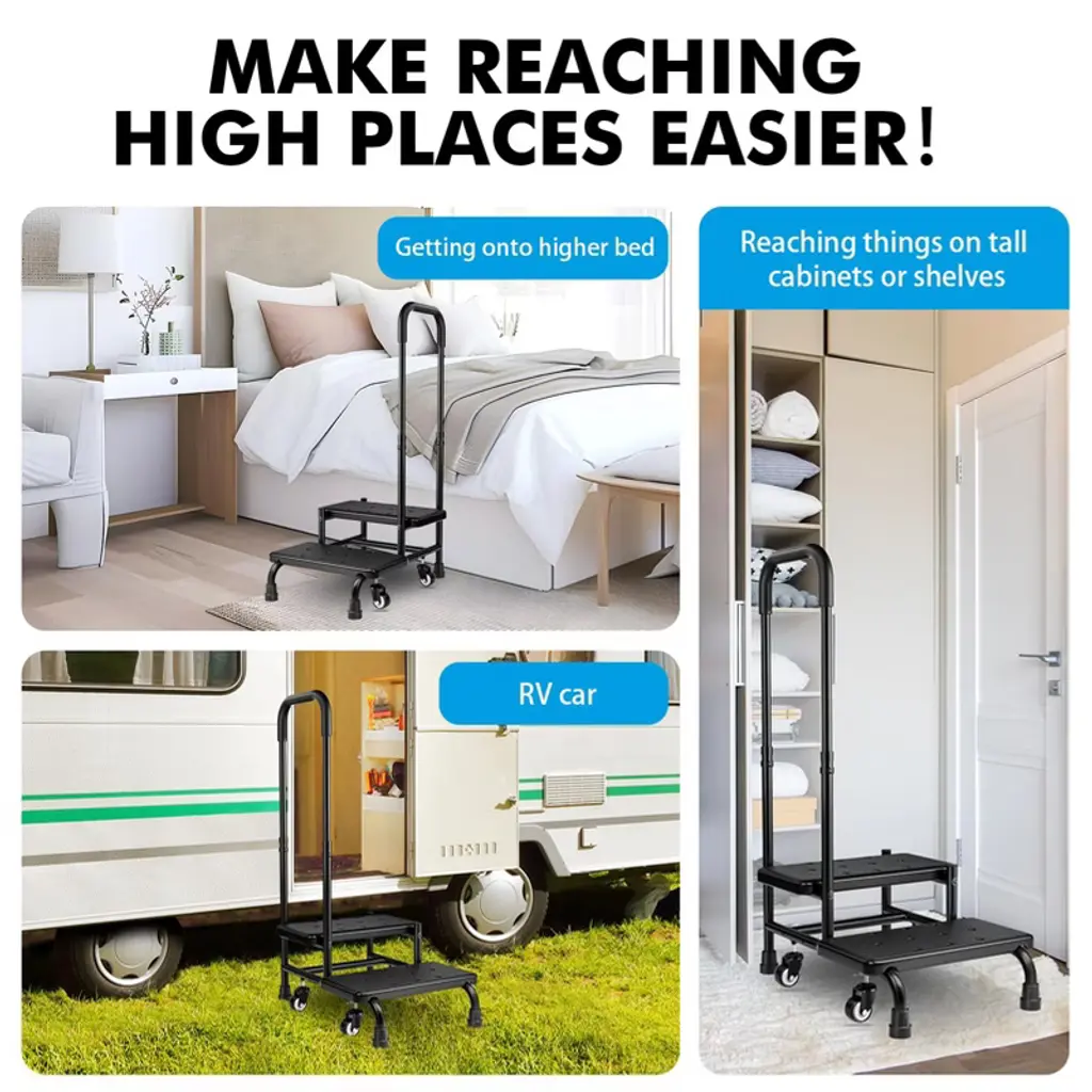 Discover the ultimate step stool designed for the elderly and adults. This heavy - duty step stool features a unique wheeled design with 2 all - around 360° rotating wheels, enabling easy movement to any location. The sturdiness is enhanced with thickened rubber foot pads, a solid welded structure, and an integrated seamless base. Installation is a breeze with the upgraded base welding integrated design, which saves steps and is 65% pre - installed. The soft handrail is flexible and adjustable in 5 heights and can be installed on either side. It has a two - step design that is knee - friendly, perfect for accessing taller beds, vehicles, and bathtubs. With a weight capacity of 450 pounds, it's highly reliable. The non - slip PU handle and thickened non - slip matte platform ensure safety, and the included glow - in - the - dark sticker adds an extra layer of safety in low - light conditions. Ideal for bedside, kitchen, car, RV, and bathtub use, it brings great convenience to daily life.