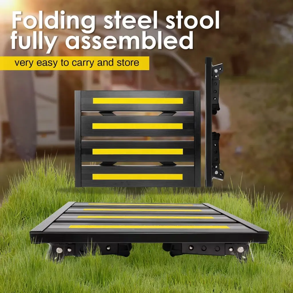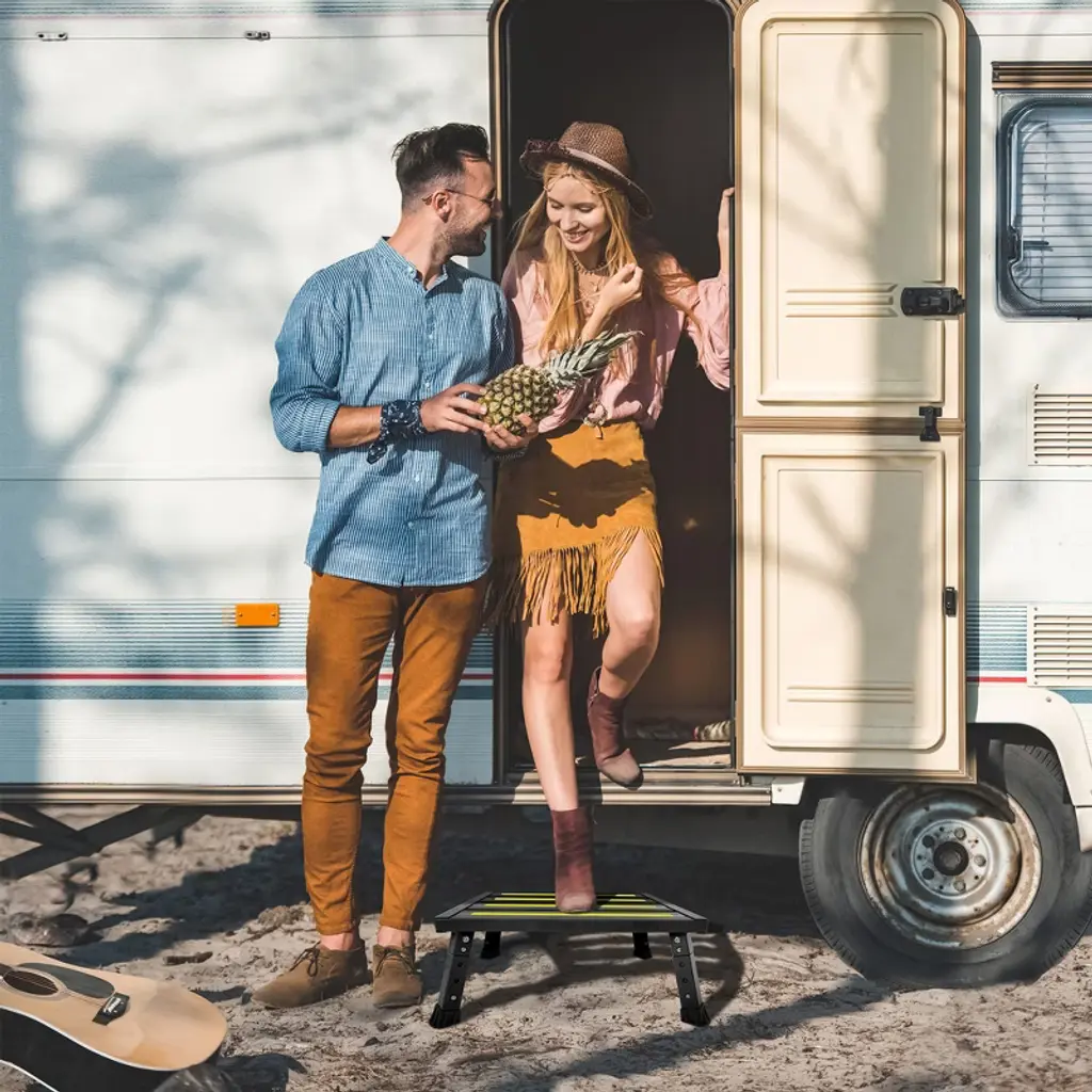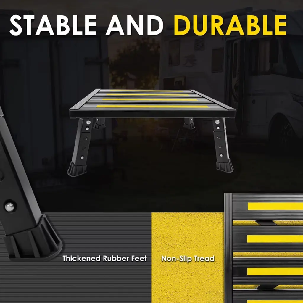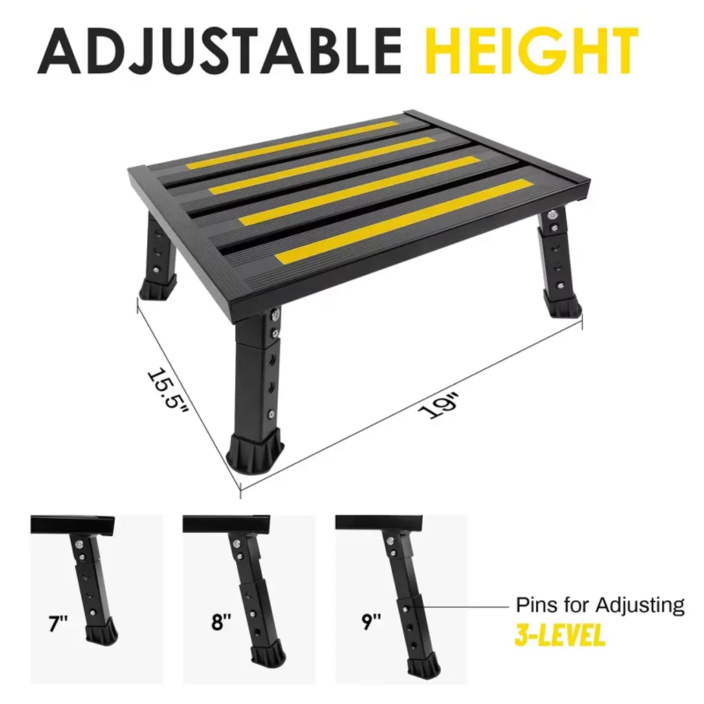 Discover this adjustable height aluminum RV step, a must - have for your outdoor adventures! Crafted with full - metal and aluminum, it offers outstanding durability. With 3 levels of height adjustment from 7 - 9 inches, you can easily adapt it to your needs by simply adjusting the gears. It's incredibly stable, thanks to anti - slip pads, gripper strips, and rubber pads, ensuring safety for children and the elderly when getting in and out of RVs, motorhomes, trailers, trucks, or SUVs. This step stool can support up to 1000 lbs, a testament to its strength. And it's not just for RVs! Use it during fishing trips or to reach high shelves at home. Its foldable design makes it easy to carry, bringing convenience to your life in multiple scenarios.