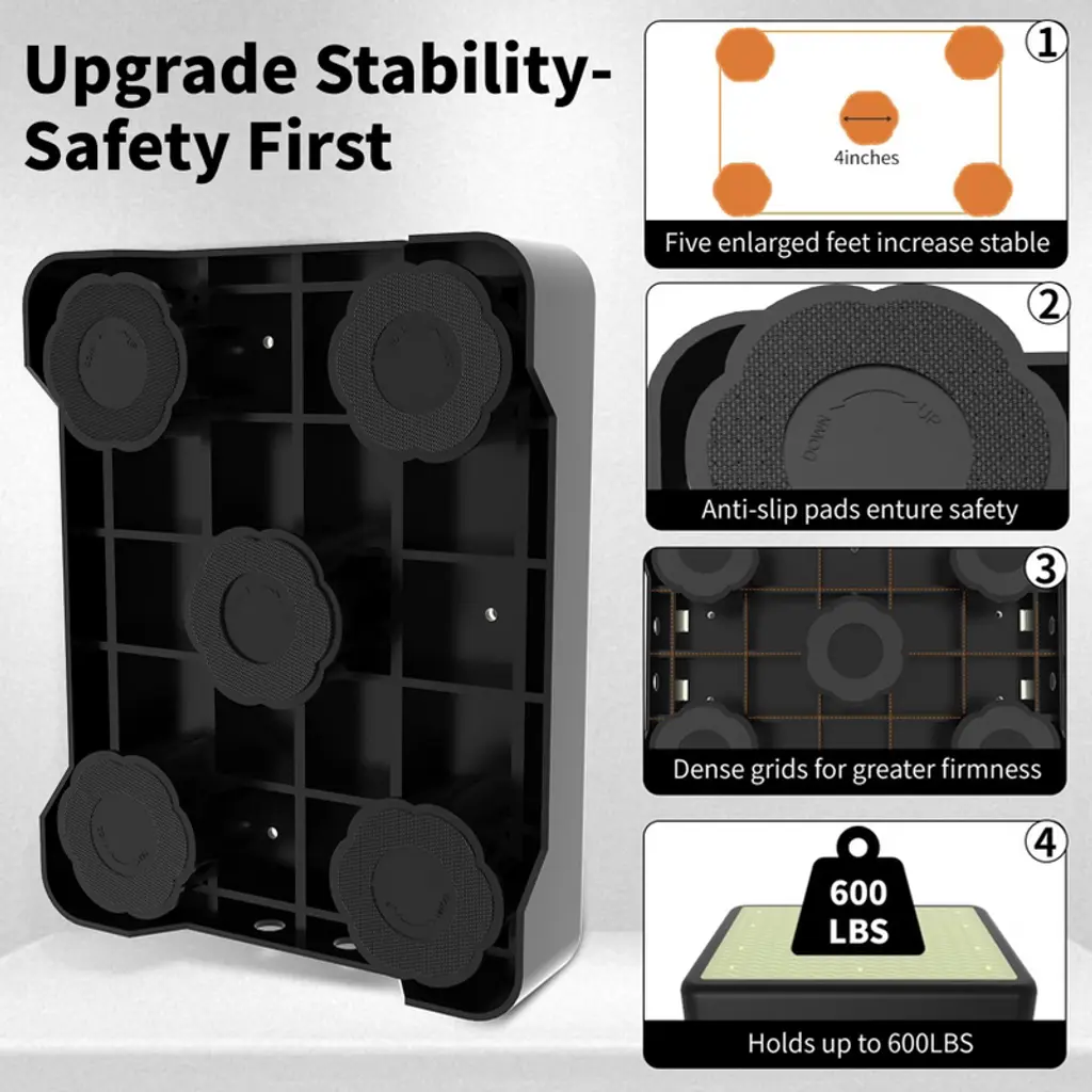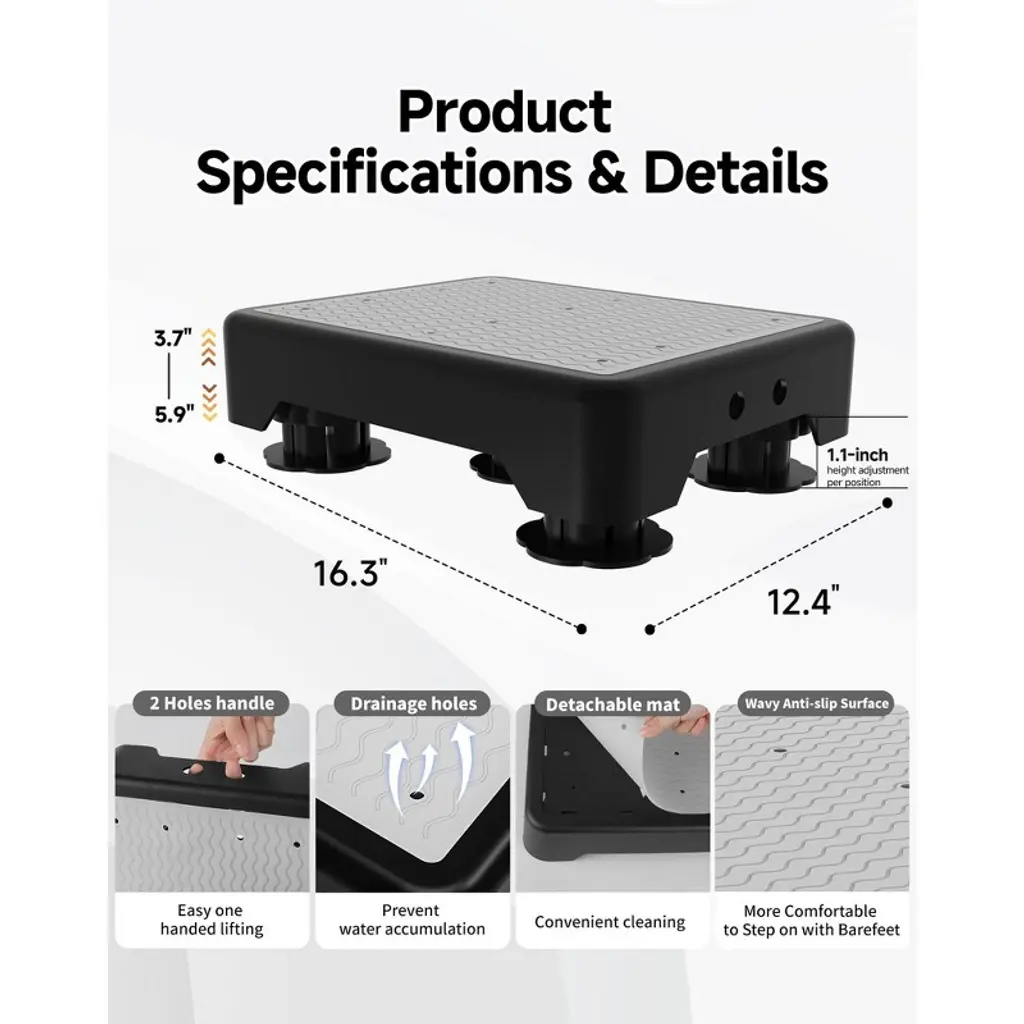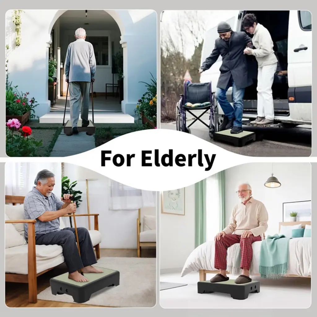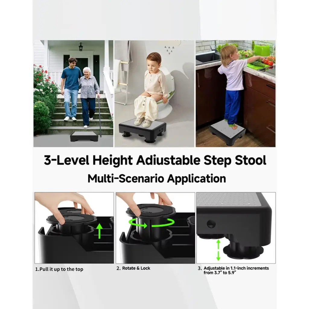 Discover the ultimate adjustable step stool designed for adults, seniors, and kids. Made from premium ABS plastic, it's durable and can withstand drops. With a 5-leg widened base, it supports up to 600 lbs, ensuring stability. The 3-setting height adjustment from 3.7" to 5.9" makes it suitable for a wide range of users and scenarios, like bathroom safety, bedside assistance, or getting in and out of a car. The wave-textured mat on the surface enhances grip and comfort, while non-slip pads on the base prevent slips. Weighing just 3.5 lbs, it's easy to carry and store. The glow-in-the-dark surface is a great feature for night use, especially for those with limited mobility. This step stool is perfect for both indoor and outdoor use, bringing convenience and safety to your daily life.