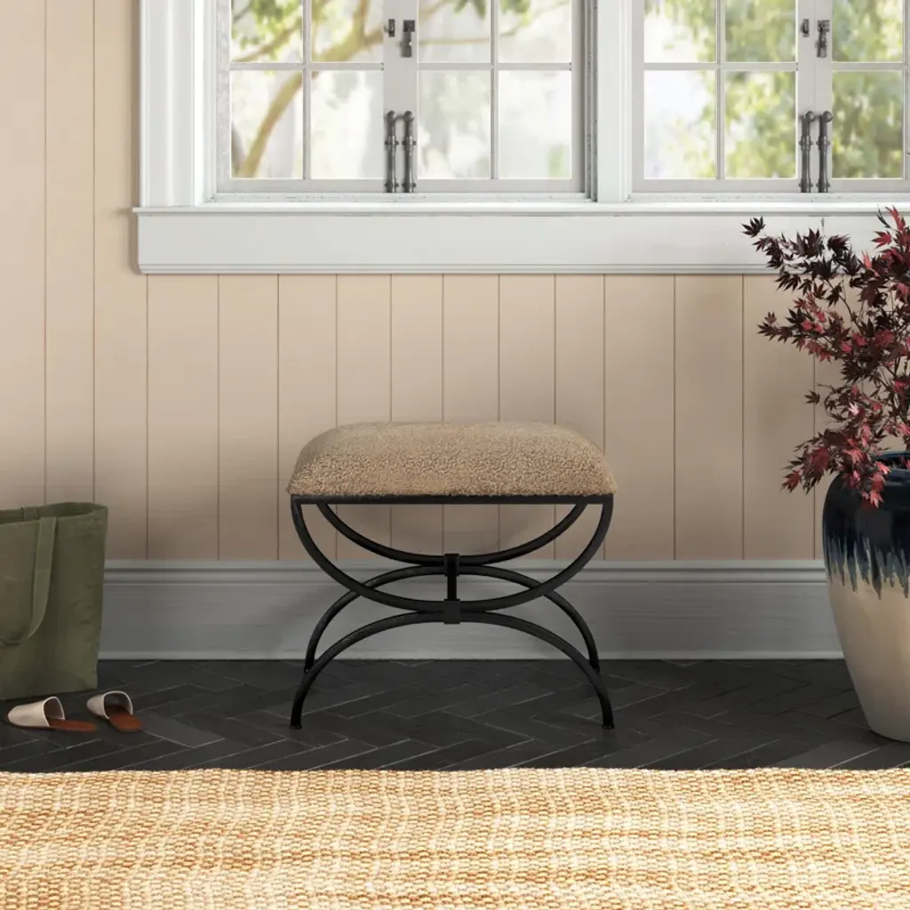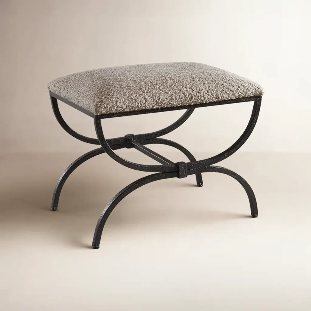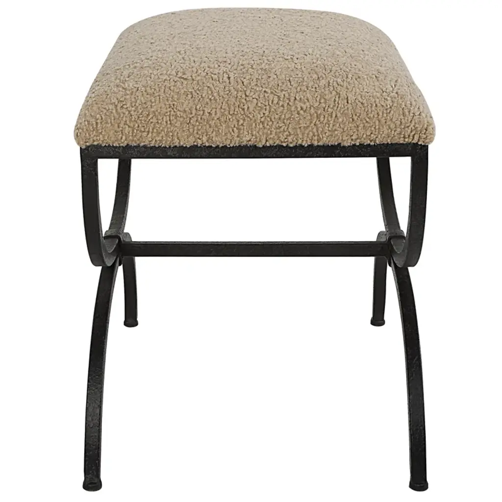 Influenced by Spanish architecture, This small bench features a heavily textured iron base finished In aged black and topped with a plush faux shearling latte.